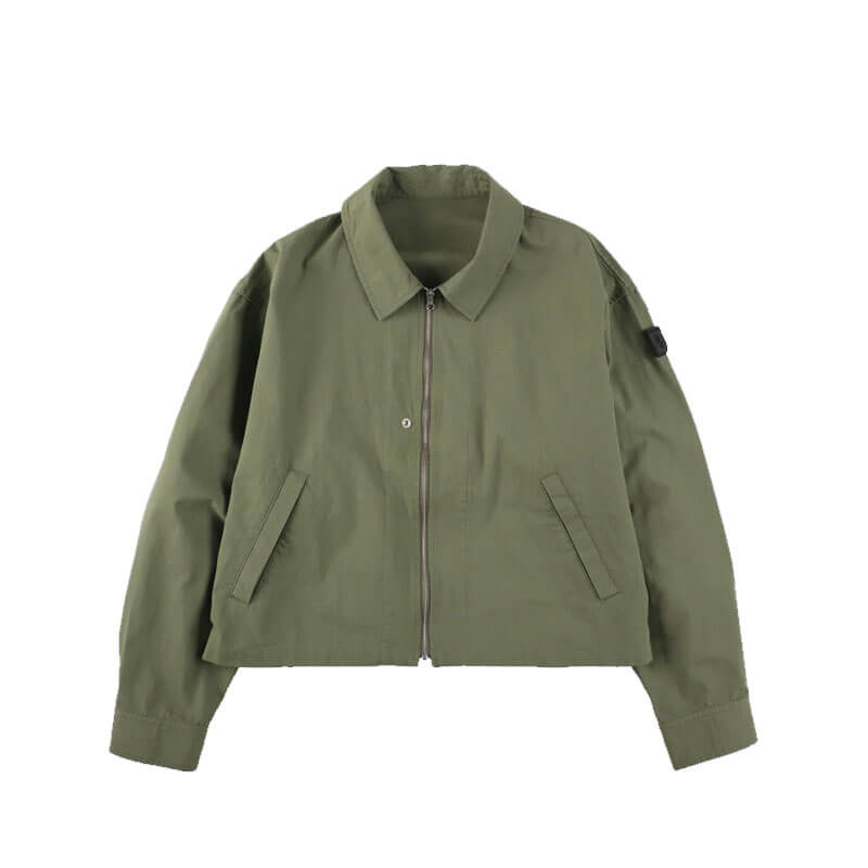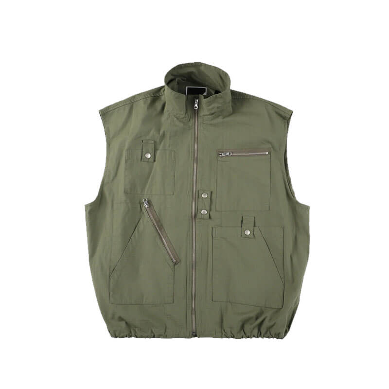 PHINGERIN Double Zip Ripstop Jacket – Olive Drab: A military-inspired blouson made from cotton ripstop fabric, featuring a layered vest + short coat style. The inner vest is slightly longer than the jacket and includes neck details, creating a voluminous, contemporary “neo-blouson” when worn together. The vest’s utility details subtly show when the top jacket is unzipped, adding a stylish touch. Inner snap buttons ensure both vest and jacket stay together. Both layers can be worn separately for varied styling options. Reversing the layering emphasizes the vest’s design, making this a unique and detail-packed blouson.