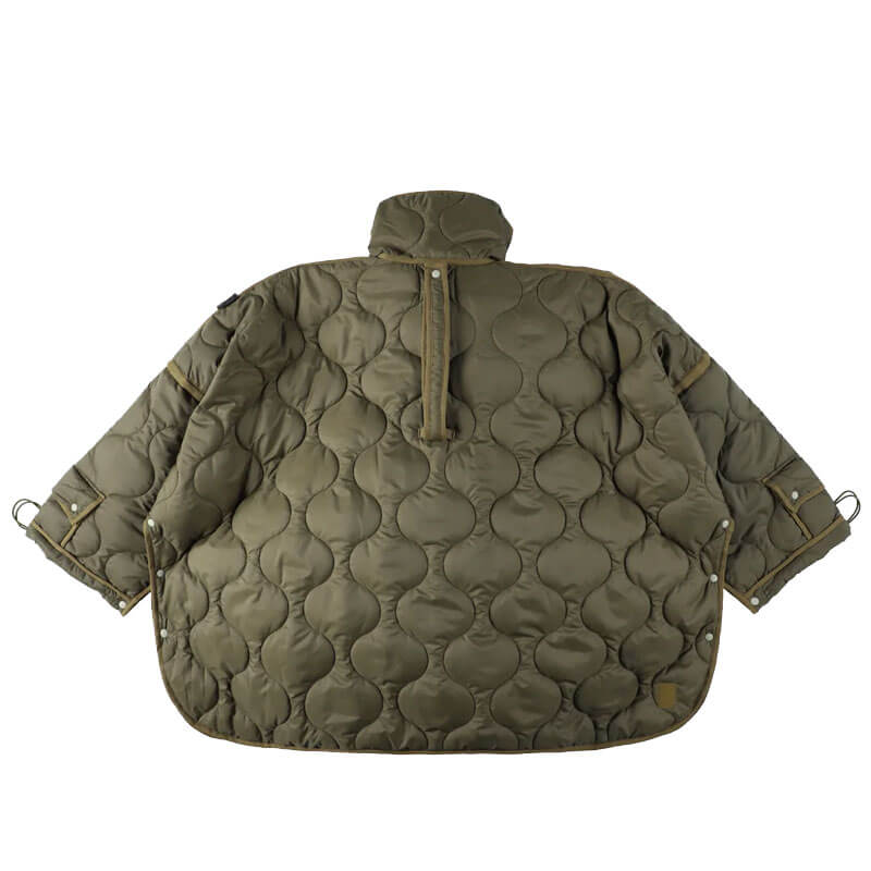 PHINGERIN Futon Quilt Coat – Olive Drab: Light futon coat with a light and stylish atmosphere, not too puffy with thin quilted padding made of peach touch polyester, perfect for transitional weathers. The military quilt is crafted in light colors, and the contrasting twill tape adds a unique touch. Its versatile design allows it to be worn as an outer layer during colder seasons, and the soft touch polyester quilt ensures comfort even when worn over light clothing. As the name suggests, when the snaps are opened, it can be spread out to sit down as a quilted blanket.