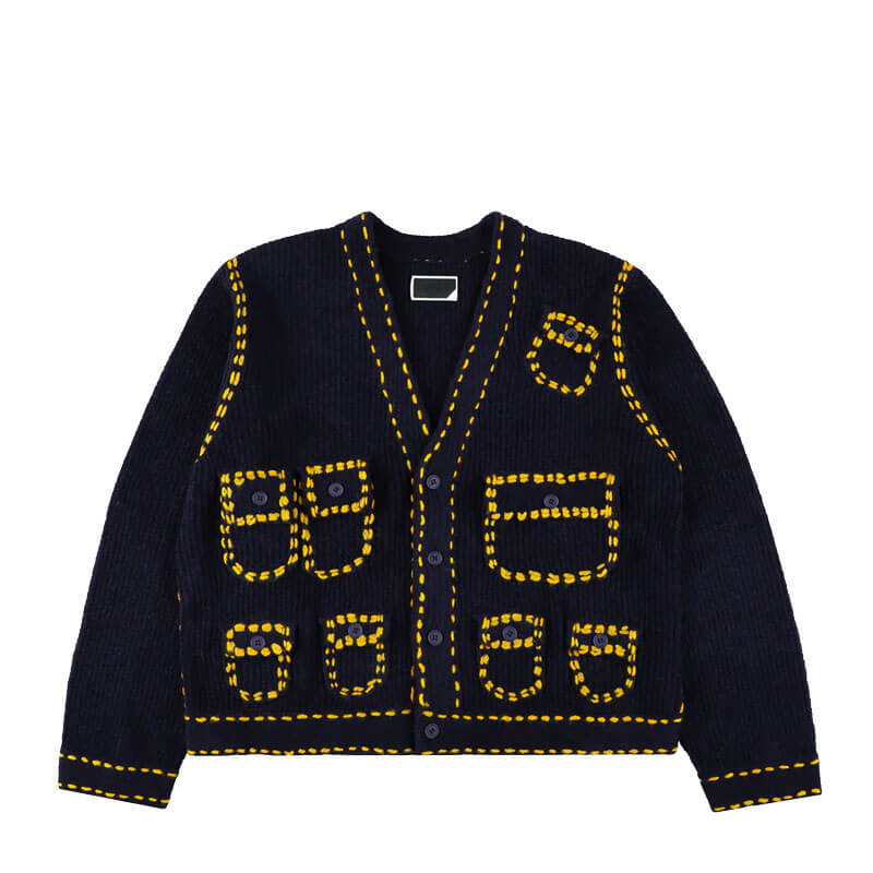 PHINGERIN PG1 Pocket Cardigan – Navy: This charming new PG1 cardigan features nine pockets of various sizes, arranged in an innocently orderly manner. It’s a playful piece that reinterprets the typically rugged image of utility wear with a literally soft and gentle touch.