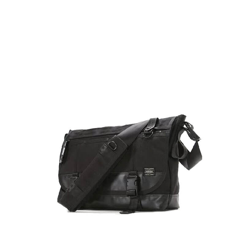 PORTER YOSHIDA & CO. Heat Messenger Bag (L) – Black: Shoulder bag with one strap crafted in ballistic nylon with leather details. A nylon band, D-shaped metal parts and a double ring are attached. You can use them as well as a carabiner and a wallet chain, to coordinate accessories such as wallets and pouches. Finished with thick nylon tapes to improve usability and durability. This PORTER YOSHIDA & CO. Heat Messenger Bag – Black features: