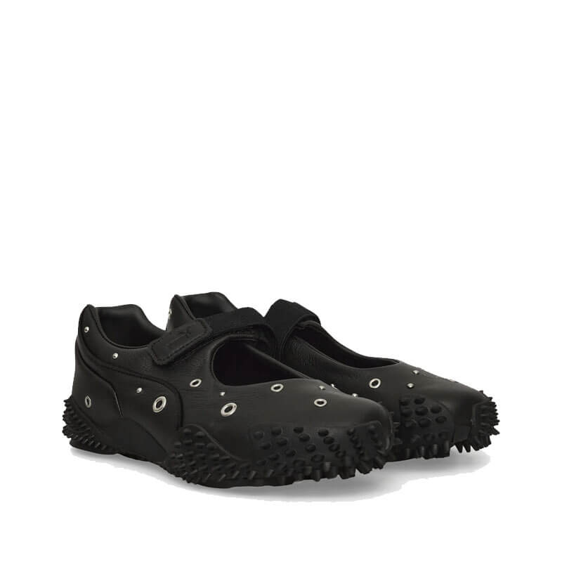 PUMA Mostro Fey Studs – Black / Silver: Mostro isn’t a shoe for just anyone. For over two decades it’s been worn by those who defy conventions and eschew the norm. Taking its name from the Italian word for monster, Mostro is a hybrid creation that draws from two diverse realms: the sleek sprinting spikes of the ‘60s and the surfing shoes of the ‘80s. To this day it continues to captivate with its distinctive, sculptural design, low-profile shape, and avant-garde, spiked sole. With the Mostro Fey, we combine the original’s signature, bold design with a delicate Mary Jane silhouette.
