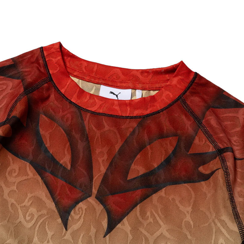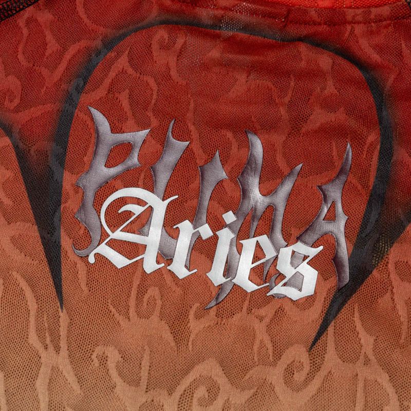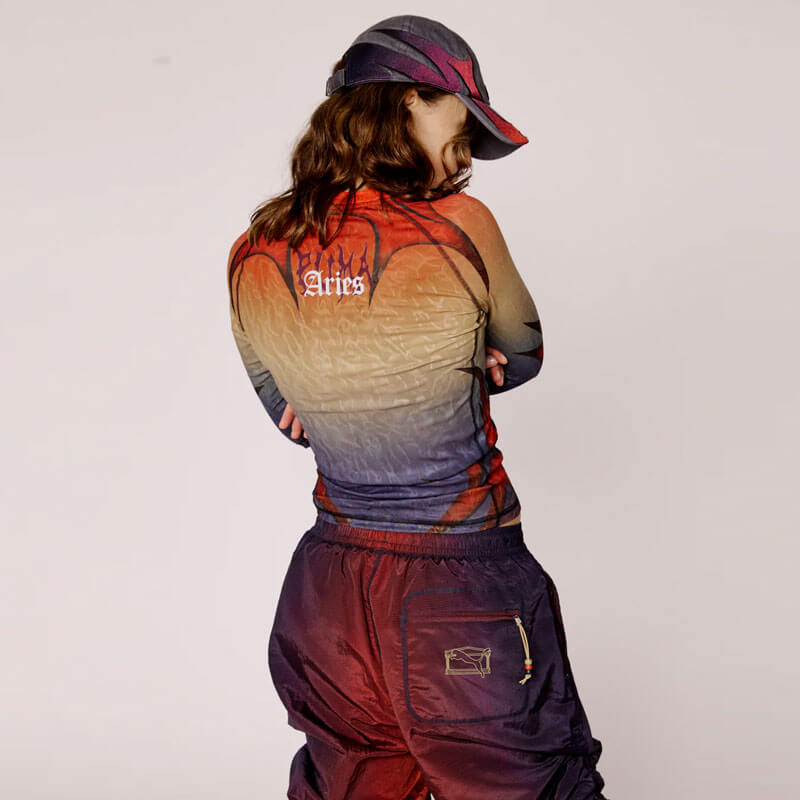 PUMA x ARIES Ombre Nylon Quarter Lace Hooded Jacket – Mars Red: Puma and Aries’ second collection, an expression of sporting and MMA-inspired design elements. Drawing from the brazen visual language that has risen from the world of mixed martial arts, embodying the collection’s physicality and fighting spirit. Inspired by ‘90s and 2000s video game references, which mimic the iconic characters, animations, and stages from fighting-genre titles.