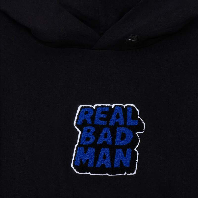 REAL BAD MAN RBM Chenille Hoodie – Black: Hooded sweatshirt printed at front and sleeve. Included in the FW22 collection, this RBM Chenille Hoodie from L.A.’s Real Bad Man features: