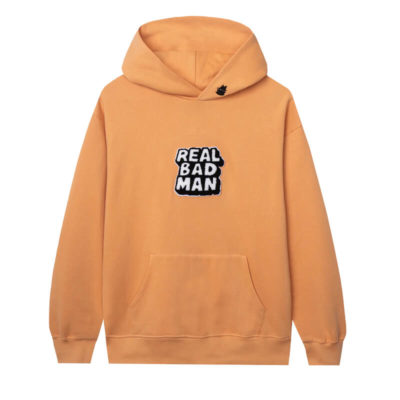 REAL BAD MAN RBM Chenille Hoodie – Orange Bang: Hooded sweatshirt printed at front and sleeve. Included in the FW22 collection, this RBM Chenille Hoodie – Orange Bang from L.A.’s Real Bad Man features:
