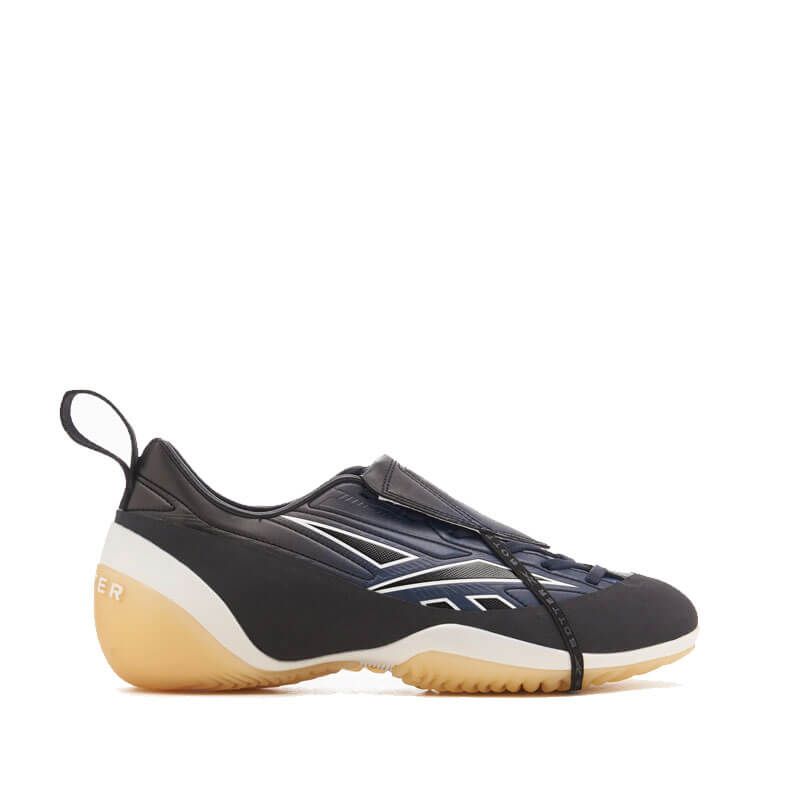 REEBOK LTD. BOTTER Energia Bo Kéts – Navy / Black: Designed in collaboration with Botter, the sleek Energia Bo Kéts draws from both climbing shoes and archival Reebok football cleats like the ‘Valde’ and ‘Instante’. The fold-over tongue sits atop an asymmetric lace-up front, while logo-print tape wraps around the contoured sole.