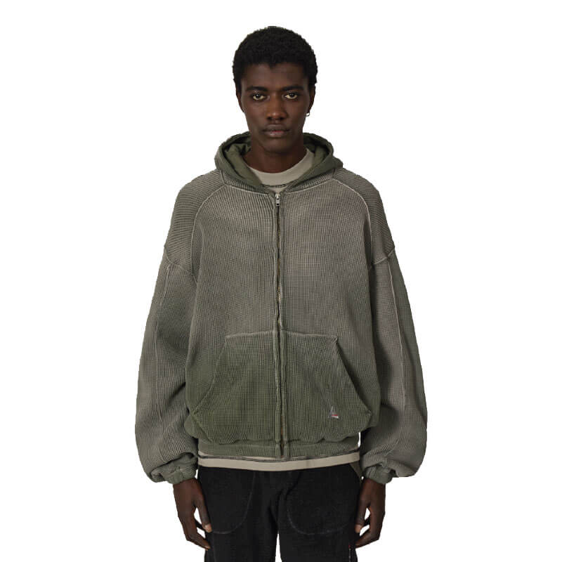 Included in the last Fall25 delivery, this ROA Hiking Bee Sun Faded Waffle Zip Up Hoodie – Olive features: