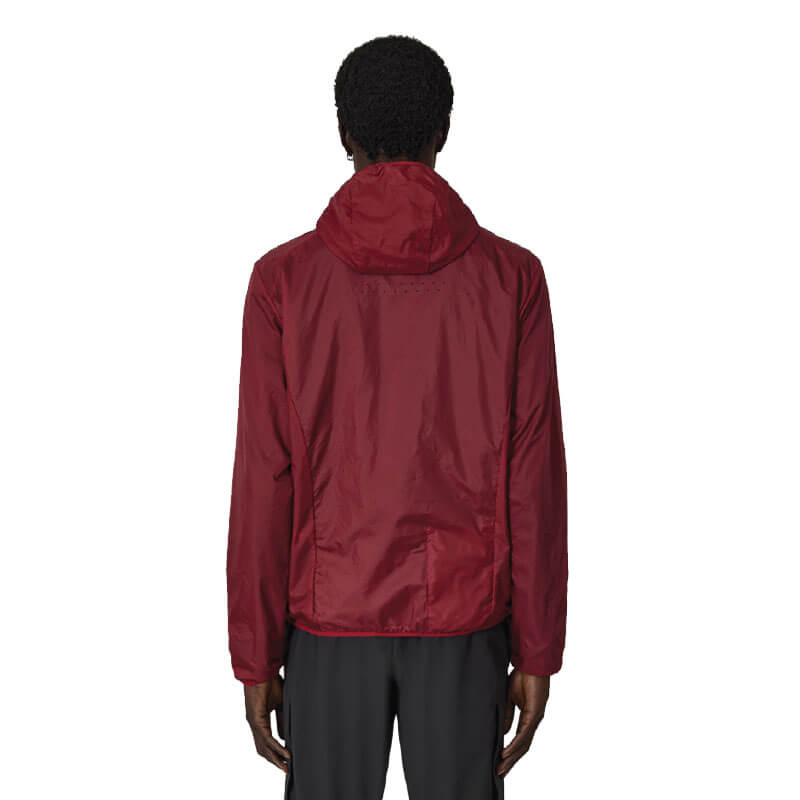 ROA Hiking Hue Packable Wind Jacket – Dark Red: Lightweight hooded windbreaker in burgundy color. Extremely lightweight transparent micro ripstop nylon with lasered details. Close fit. Packable for easy use and storage. Centerline zipper opening and two front pockets.