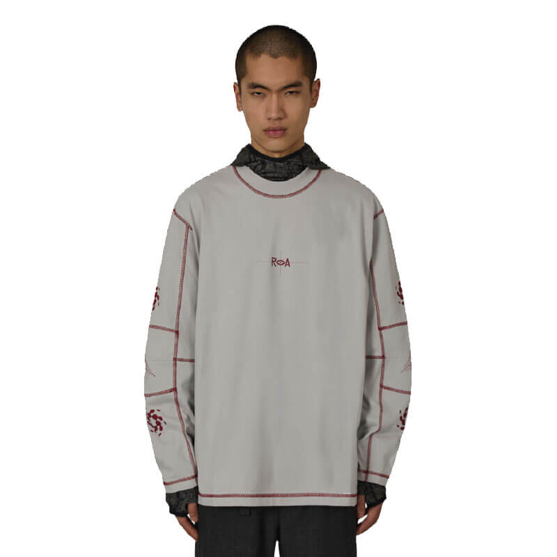 ROA Hiking Info Stitch Organic Long Sleeve – Light Grey: Long sleeve graphic tee made of heavy-weight organic cotton jersey, light grey color. Printed contrasting design on the front, and printed design on the back in red halia color. Ribbed collar.