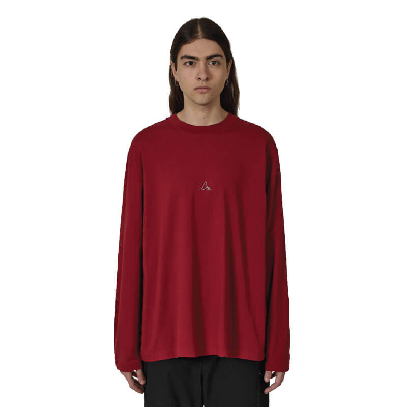ROA Hiking Logo Organic Long Sleeve – Dark Red: Long sleeve tee made of a lightweight, organic cotton jersey, dark red color. Embroidered, contrasting logo on the front. Ribbed collar, elasticated cuff. Loose fit.