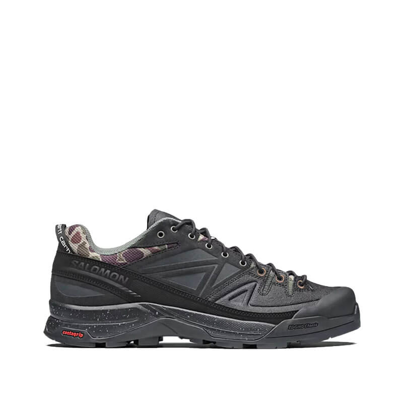 SALOMON X-ALP Carhartt WIP – Black: Carhartt WIP and Salomon return for their second collaboration with the new X-ALP Carhartt WIP: A shoe constructed to meet the demands of any environment, built from years of collective design expertise. Featuring the X-ALP’s trademark protective toecap and lateral power band, the shoe also incorporates robust grainy leather and suede overlays, accented with Carhartt WIP’s signature camouflage.