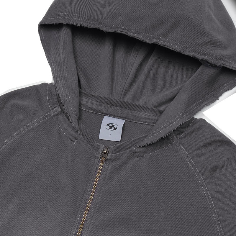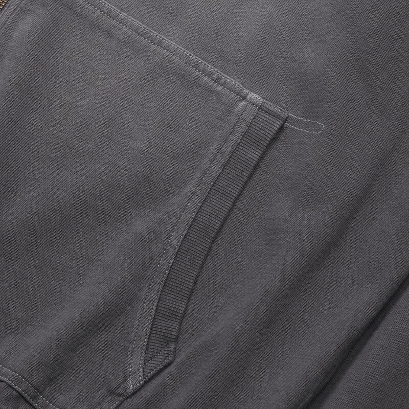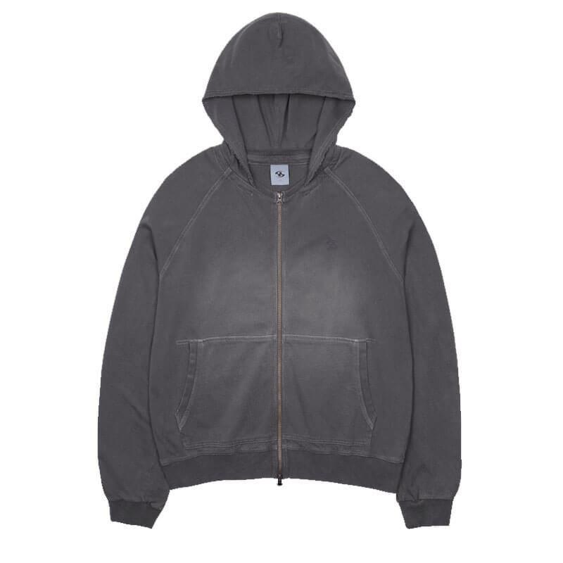 SAN SAN GEAR Washed Hoodie Zip-Up – Charcoal: Hooded sweatshirt with full zippered closure. Crafted in a cotton material with pigmented dyed and washed finishing, is a thin and flowy fabric that allow creates a relaxed and draped silhouette.