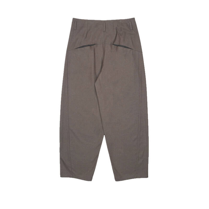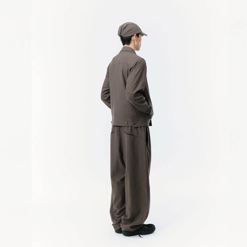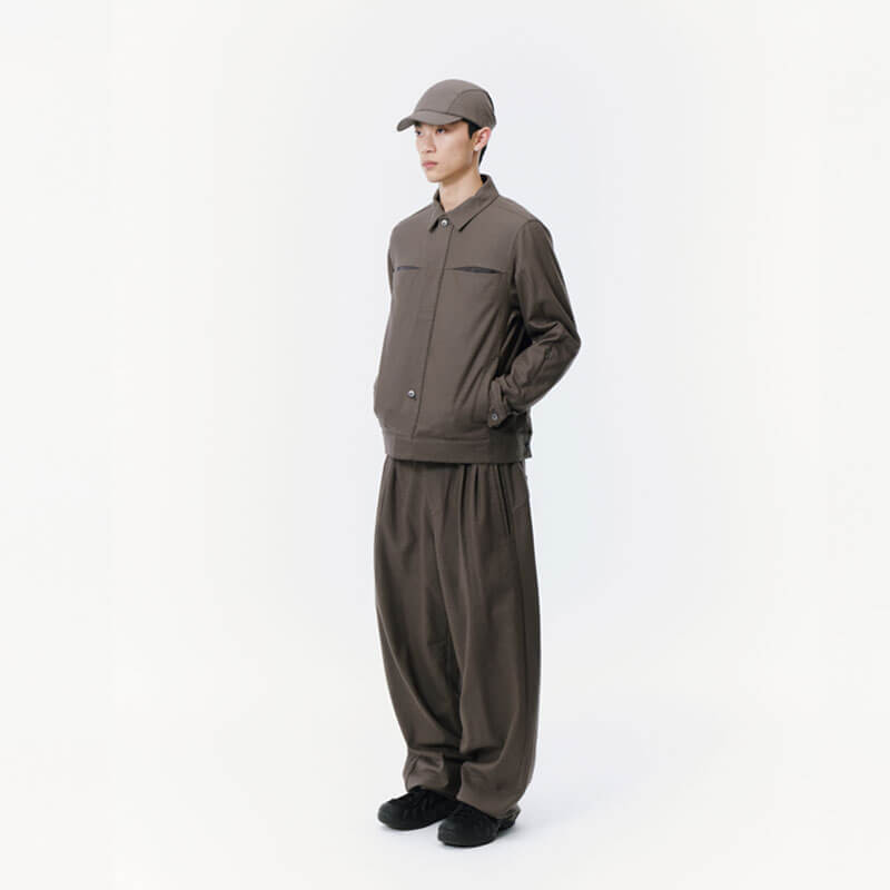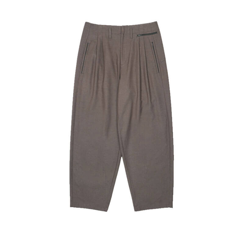 SAN SAN GEAR Wide Pants – Brown: Tailoring wide silhouette pants crafted in a lightweight wool-rayon blend material. Featuring front pleats and tailoring fake pocket on back, that when is opened, it intentionally creates a relaxed drap.