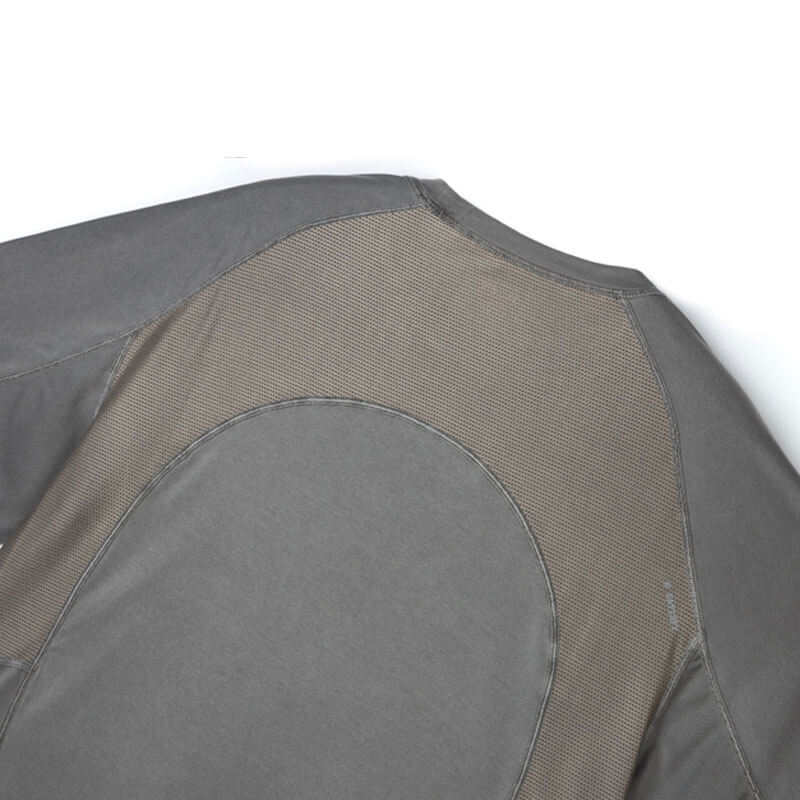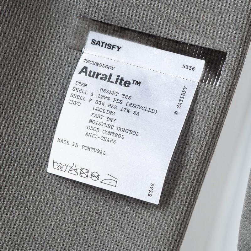 SATISFY® AuraLite™ Desert Tee – Mineral Graphite: Mineral dyed AuraLite™ Desert Tee with COOLMAX® panels strategically placed for cooling. Constructed from a recycled AuraLite™ knitted fabric from Japan. AuraLite™ is anti-wrinkle, anti-snagging and provides superior moisture management.