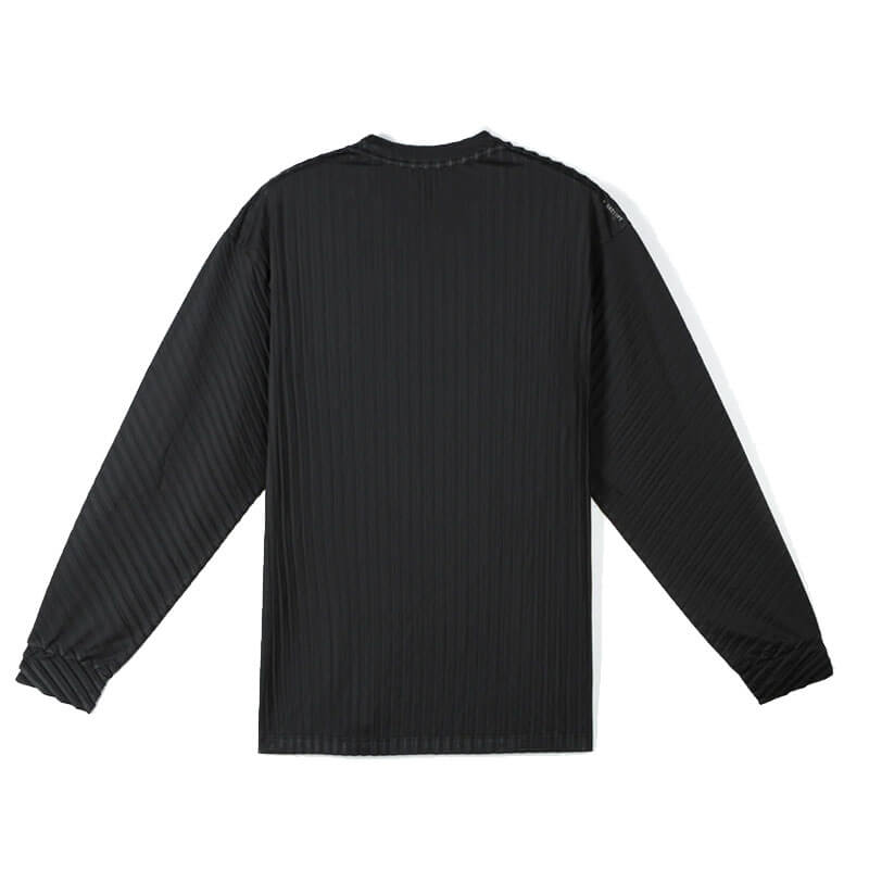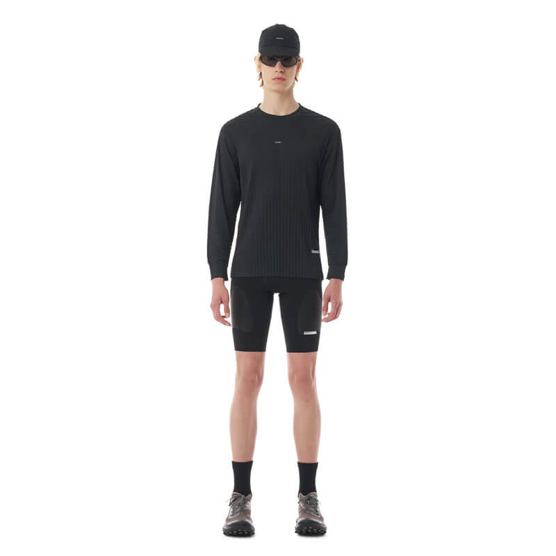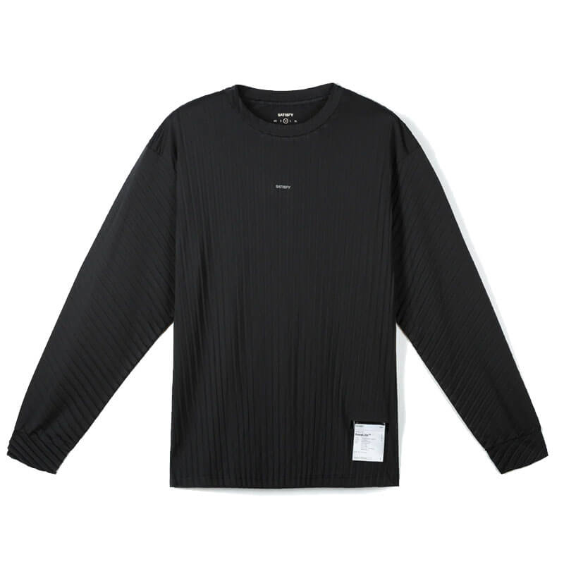 SATISFY® AuraLite™ Pleated Long Tee – Black: Motion and heat meet air and flow. 138 grams of pleated super-lightweight AuraLite™ from Japan. Engineered folds reduce skin contact, creating channeled cooling. For exploration without friction.