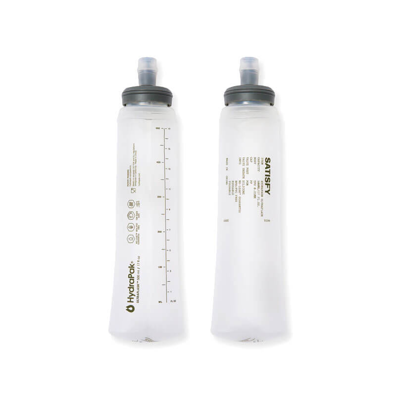 - Comes with two SATISFY® 500ml soft flasks designed in collaboration with HydraPak®