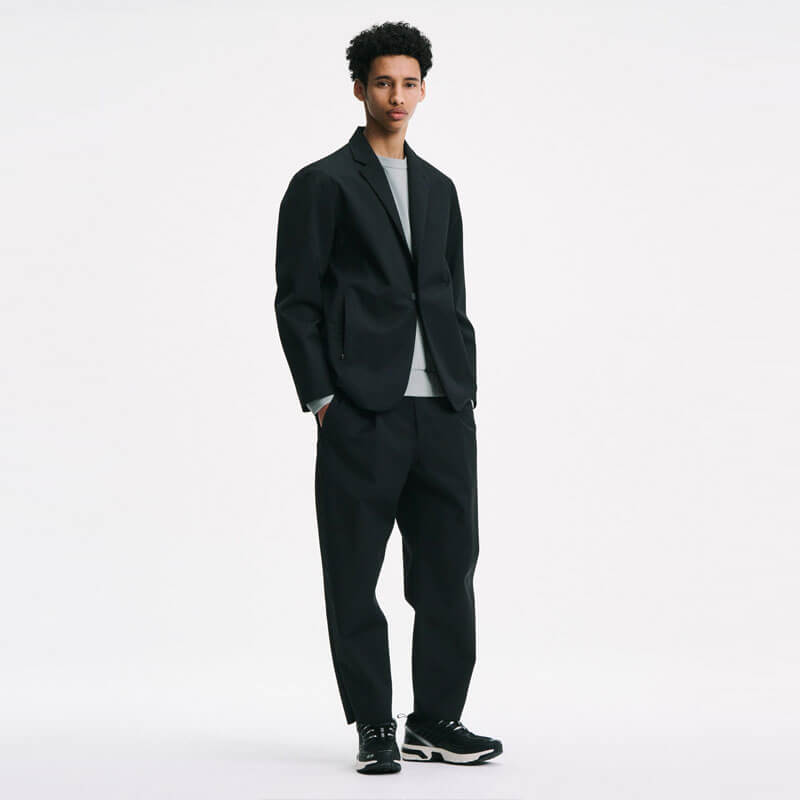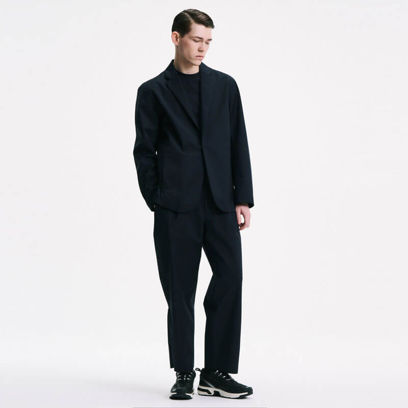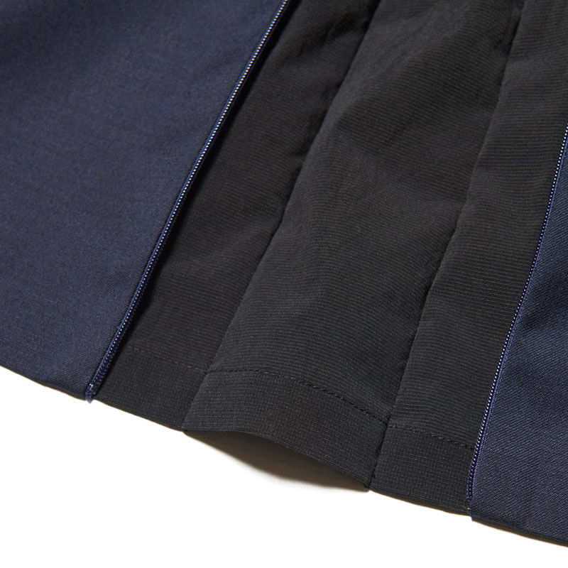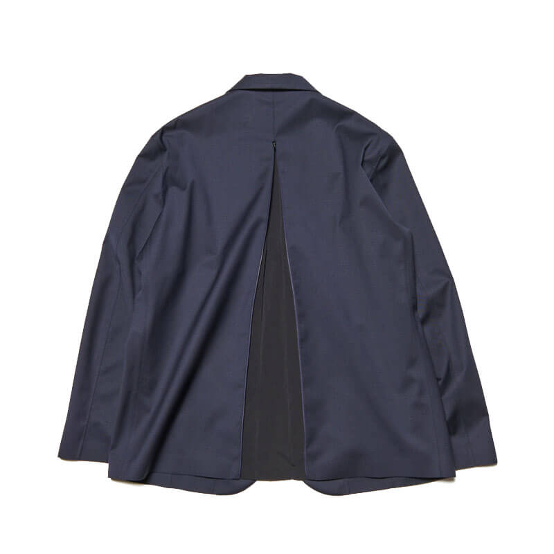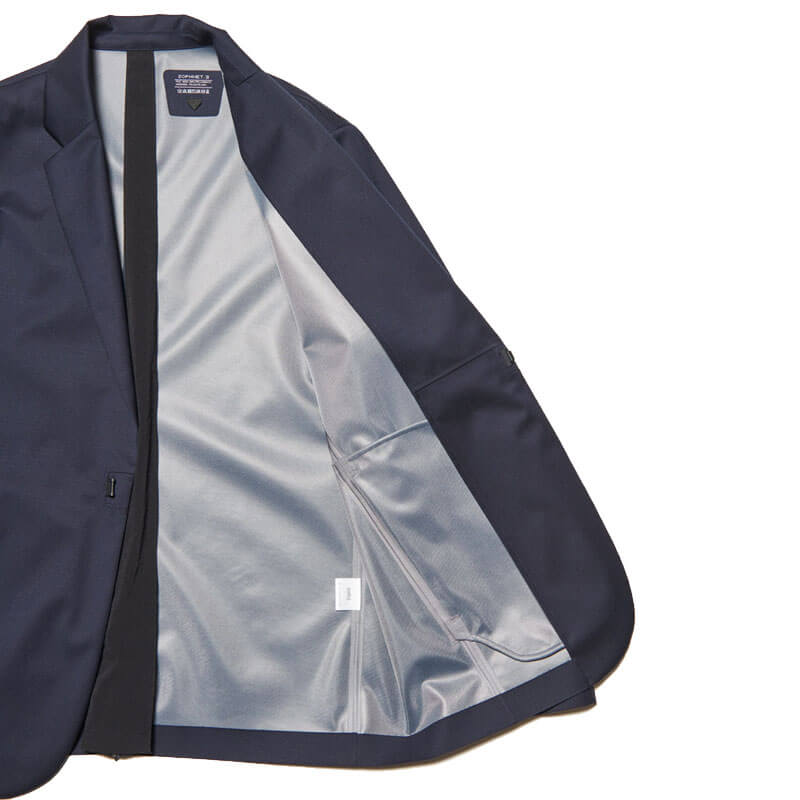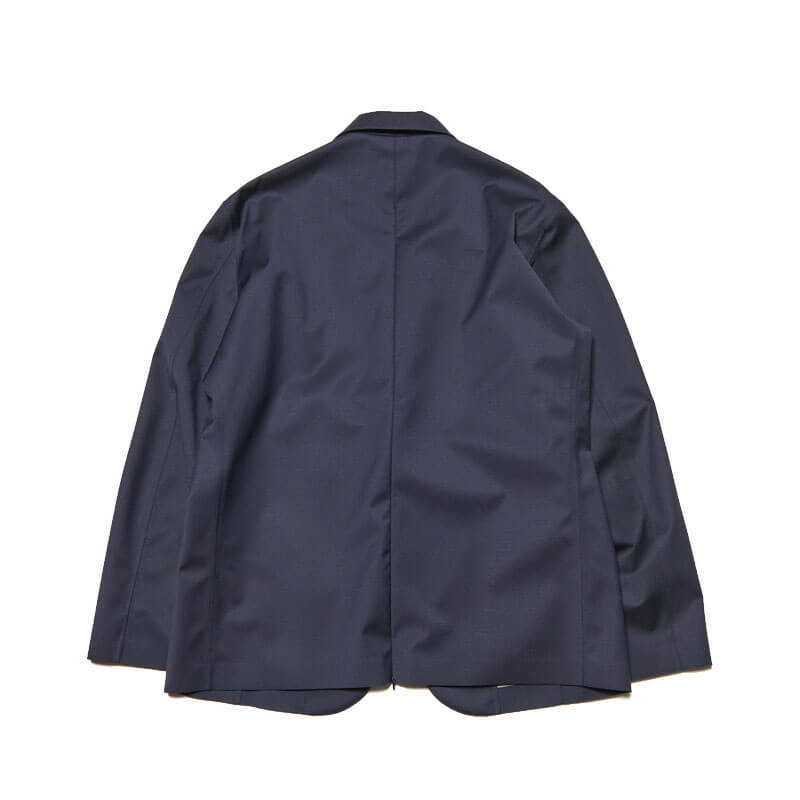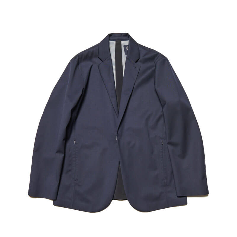 SOPHNET. 3Layer Wool Tech Jacket – Navy: This lapel jacket is made from lightweight, durable, waterproof, and breathable 3-layer wool. Front hooks and concealed pockets create a minimalist look. The material’s just the right amount of firmness enhances its sophisticated look. Functional vents allow you to adjust the silhouette and breathability by adjusting the opening width, and underarm ventilation contributes to regulating the environment inside the garment. This tailored item retains the elegance of wool while adding systematic elements. Slacks made from the same fabric are also available.