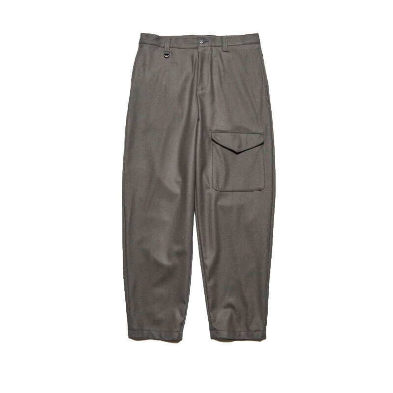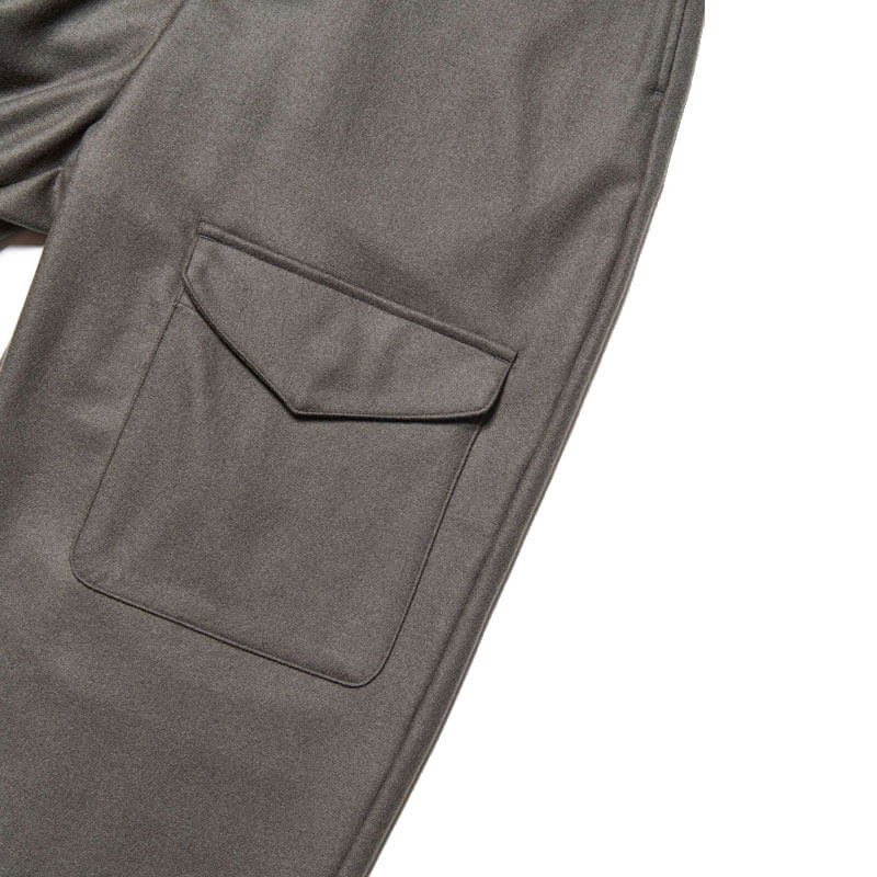 SOPHNET. Light Melton Wool Royal Navy Pants – Charcoal Gray: These new military pants feature a distinctive flap pocket on the left thigh. The silhouette gently widens towards the knee and tapers towards the hem. The light Melton lambswool has been milled to create a fluffy surface, resulting in a matte texture. The understated detailing and matching material create a pair of bottoms that exude elegance despite their military origins.