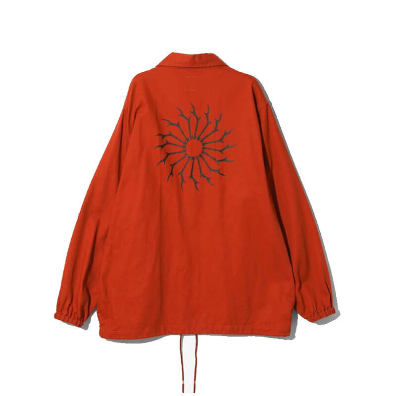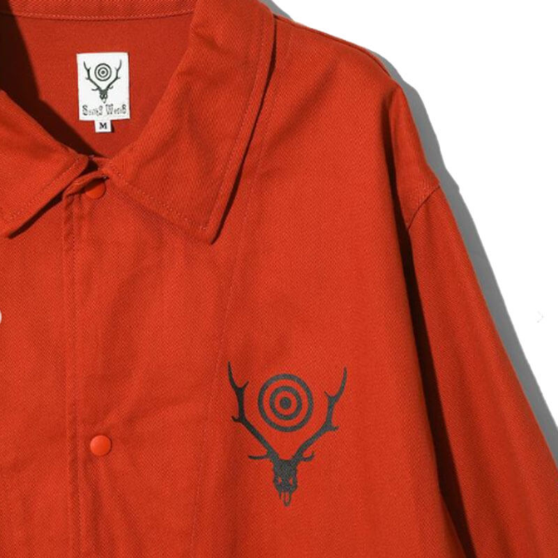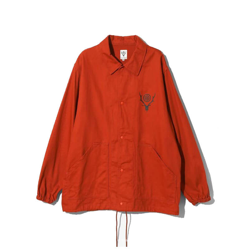 SOUTH2 WEST8 Coach Jacket – Coral Red: South2 West8 reimagines a sportswear icon with this coach jacket, which features a contrasting stag’s head logo at the chest. Classic collar and snap button closure complete the design.