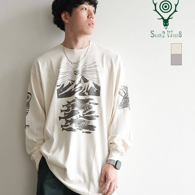 SOUTH2 WEST8 x F. KITAMURA LS Tee – Natural: This is a collaboration between Hokkaido printmaker Futoshi Kitamura and SOUTH2 WEST8. The print art, which features Hokkaido’s flora and fauna, trout, and famous mountains, is expressed in monochrome prints, creating a humorous and detailed worldview. The original logo, reinterpreted from Kitamura’s perspective, is also a highlight.