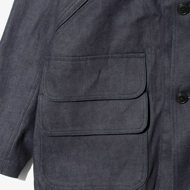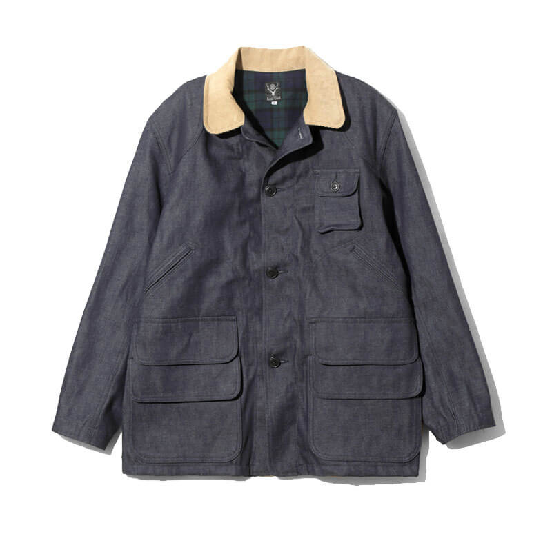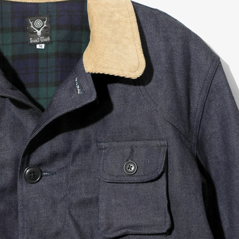 SOUTH2 WEST8 Hunting Jacket – 12oz Denim: This Hunting Jacket by South2 West8 is inspired by vintage outdoors jackets, with a classic corduroy collar and button closure. Many details have been added to the front and back, with double layered storage pockets under the hand warmer pockets, two flap pockets in the back and a single chest pocket on the left side. The boxy silhouette makes it easy to layer over other items.