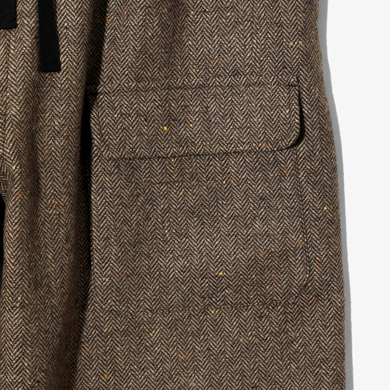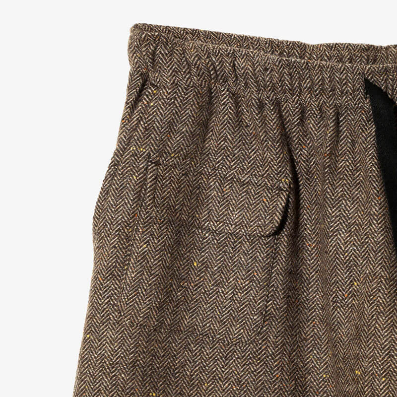 SOUTH2 WEST8 String Balloon Tweed Pant – Brown: These balloon pants feature a relaxed, wide silhouette, drawstring waist and hem, and asymmetrically placed patch and flap pockets. They offer a comfortable, comfortable fit without being restrictive. Wool neps are small bulges on the surface caused by thickened or tangled fibers. These neps give the tweed fabric a unique texture and depth, creating a classic look.
