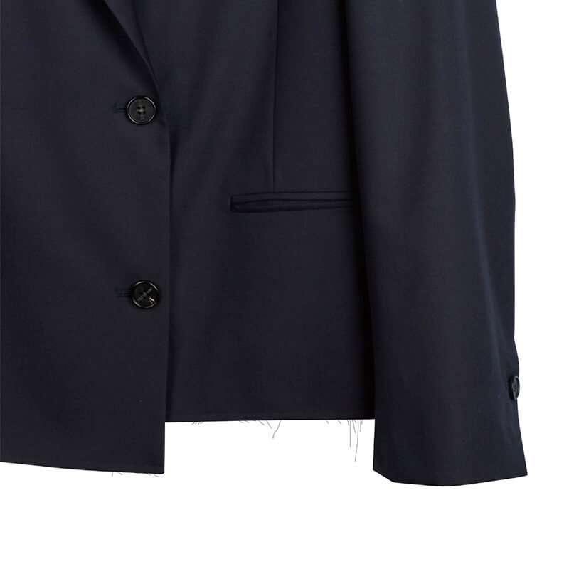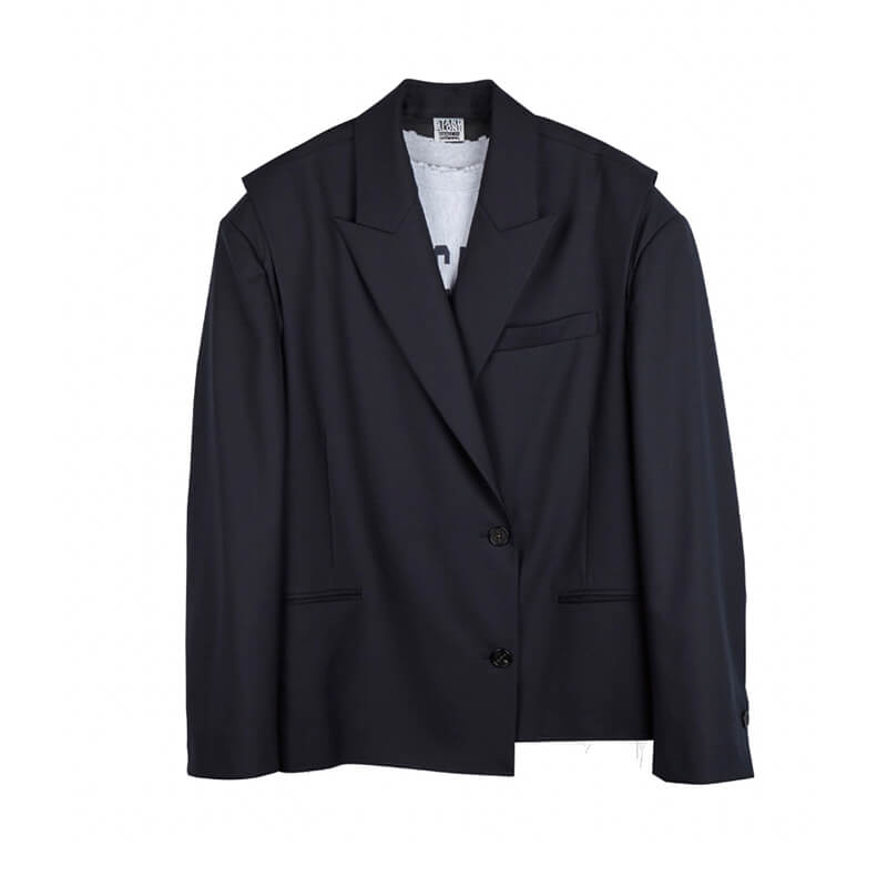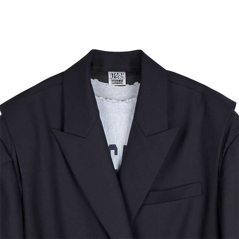 STAND ALONE Two-Way Layered Blazer – Navy: Summer wool layered double breast blazer. A variety of styling is possible with the vest and crop top set-up items. Featuring a low-edge finished hemline and vintage printing on the front crop top, this cool STAND ALONE Two-Way Layered Blazer – Navy is included in Spring-Summer 23 collection and features: