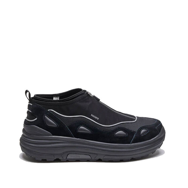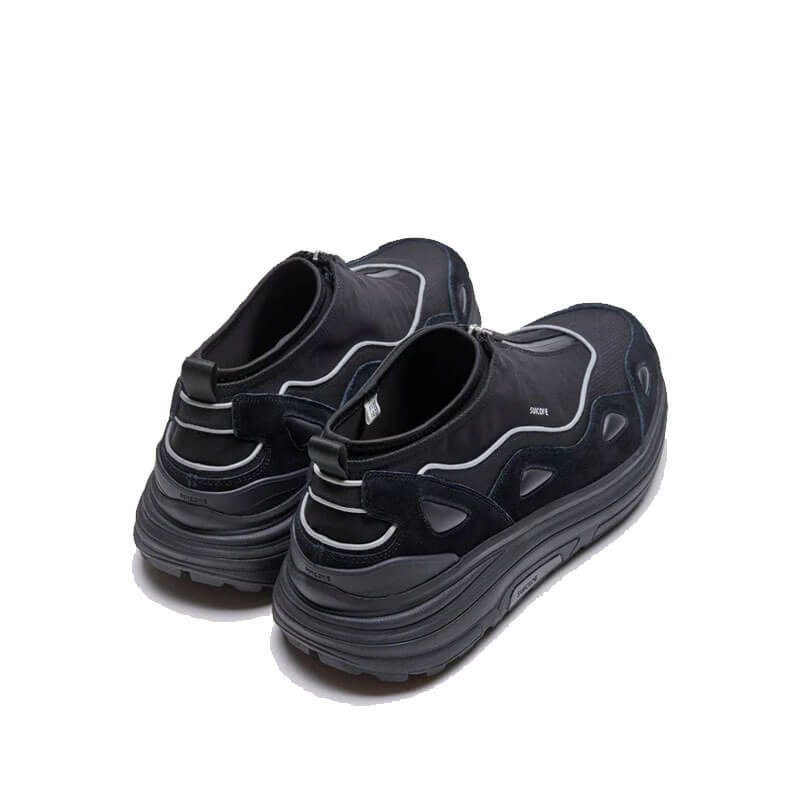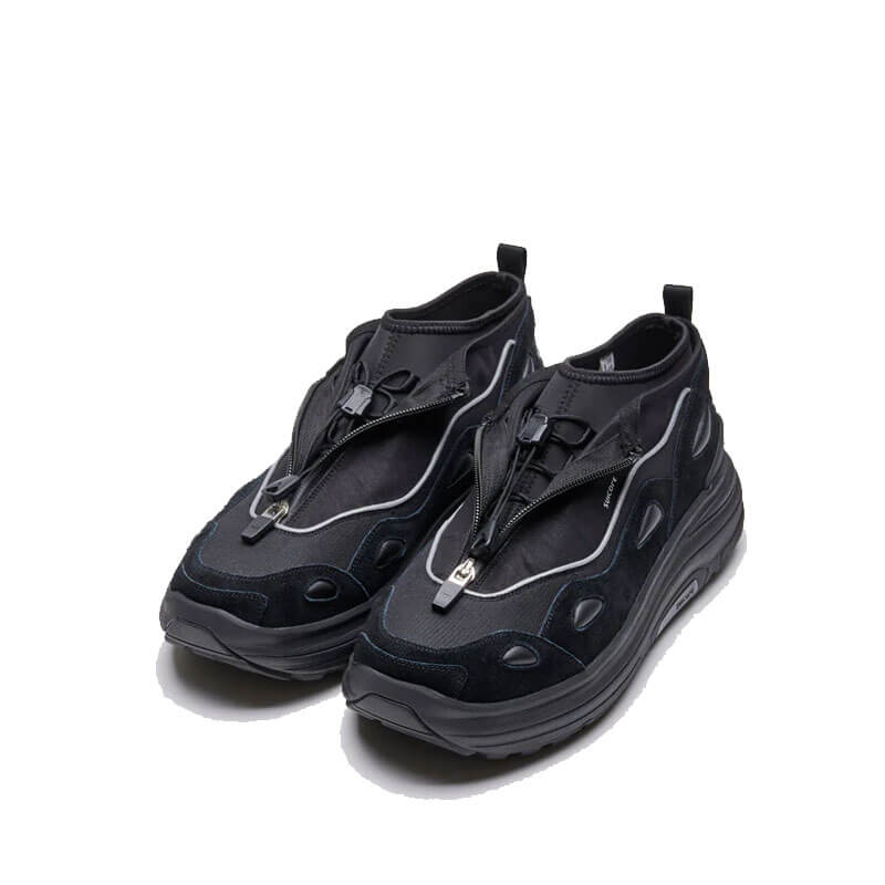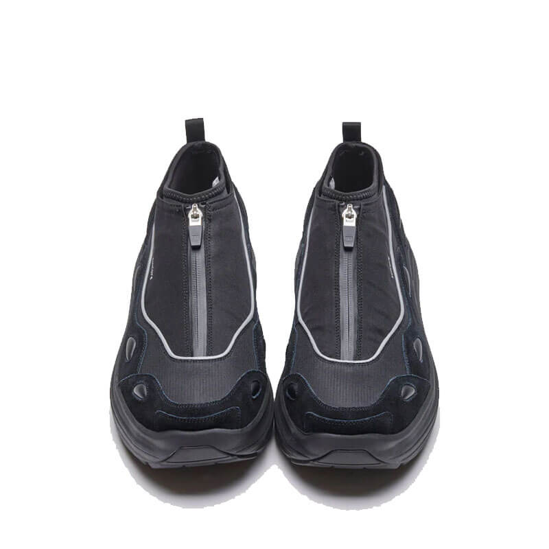 SUICOKE Akk-Zip – Black: A layered style built upon the AKK silhouette, the mid-top design provides a winterised construction of the sneaker model; equipped with a laser-bonded zip and nylon upper layer for maximum water- resistance and flexibility. An internal neoprene sock provides a comfortable inner layer, with adjustable toggles allowing for a customisable fit.