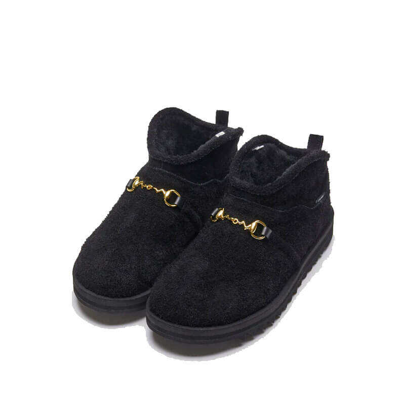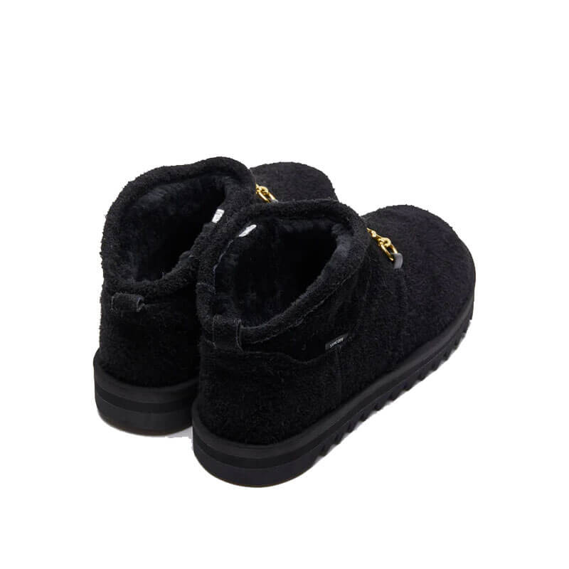 SUICOKE New Wave Bit-Boot – Black: A brand-new FW24 style, the NW BIT-BOOT is a slip-on, classically- inspired design that incorporates a warm mouton lining inner and the SUICOKE original ripple outsole. Finished with a hairy leather suede upper, woven label and branded metal buckle detailing.
