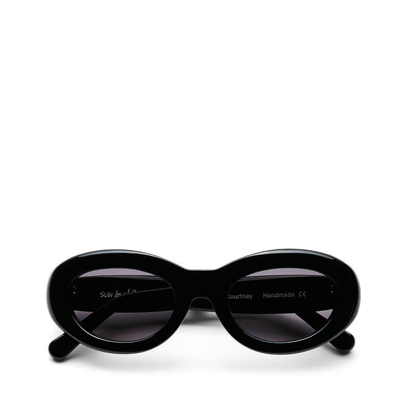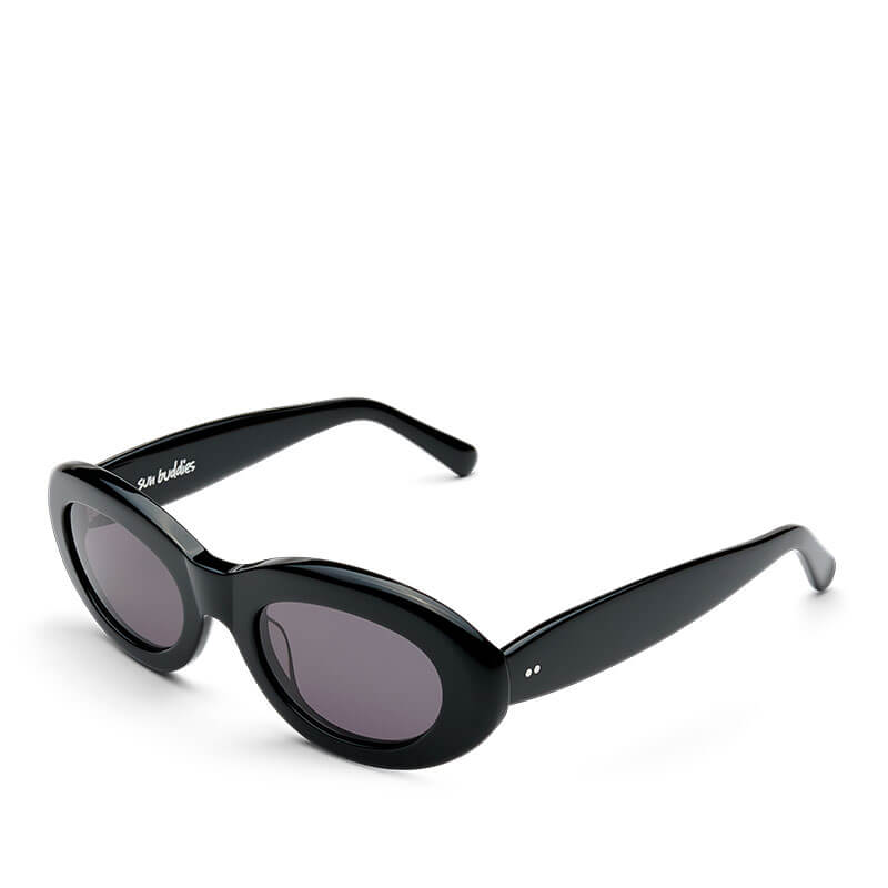 SUN BUDDIES Courtney Sunglasses – Black: Solid colored shiny oval 90’s inspired frame in black, handmade of Italian acetate. Black Carl Zeiss lenses with 100% UV protection and a seven bar hinge with two visible rivets on the temple. Comes in a luxurious faux leather hard case and a glossy paper box. Cleaning cloth included.