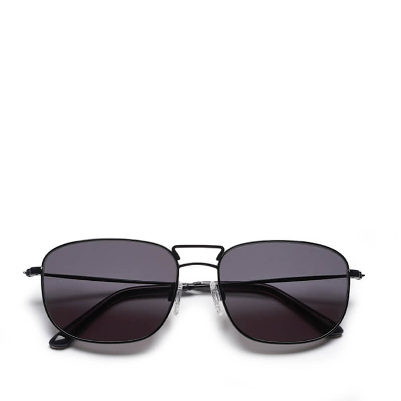 SUN BUDDIES Giorgio Sunglasses – Black / Transparent Grey: Square 80’s inspired metal frame in a black colorway with grey temple tips, handmade of stainless steel and Italian acetate. Black Carl Zeiss lenses with 100% UV protection and a three bar hinge with vintage inspired details on the temple. Comes in a luxurious faux leather hard case and a glossy paper box. Cleaning cloth included.