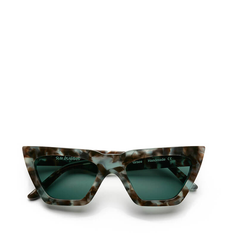 SUN BUDDIES Grace Sunglasses – Midgar: Semi transparent, thin and sharp inspired frame in a brown, blue and yellow tortoise colorway, handmade of Italian acetate. Black Carl Zeiss lenses with 100% UV protection and a seven bar hinge with two visible rivets on the temple. Comes in a faux leather case and a glossy paper box. Cleaning cloth included.