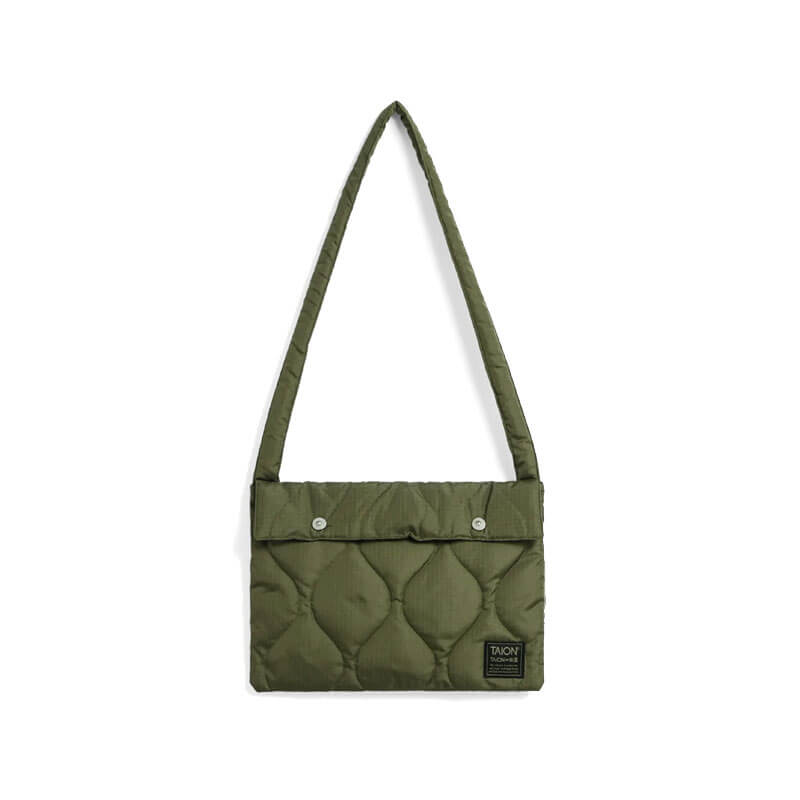 TAION Military Down Sacoche – Multi: Down-filled fabrics are paramount to TAION’s designs, with pieces like this Tote Bag synonymous to the Japanese label. It’s crafted using the usual water repellent, light, soft, fluffy and voluminous feel that is unique to down, then accented with a color scheme of the TAION logo print.