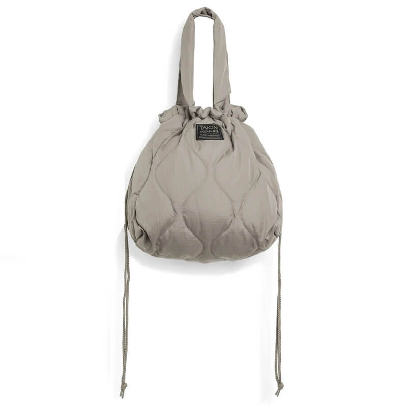TAION Military Down Tote Bag M – Light Mocha: Down-filled fabrics are paramount to TAION’s designs, with pieces like this Tote Bag synonymous to the Japanese label. It’s crafted using the usual water repellent, light, soft, fluffy and voluminous feel that is unique to down, then accented with a color scheme of the TAION logo print.