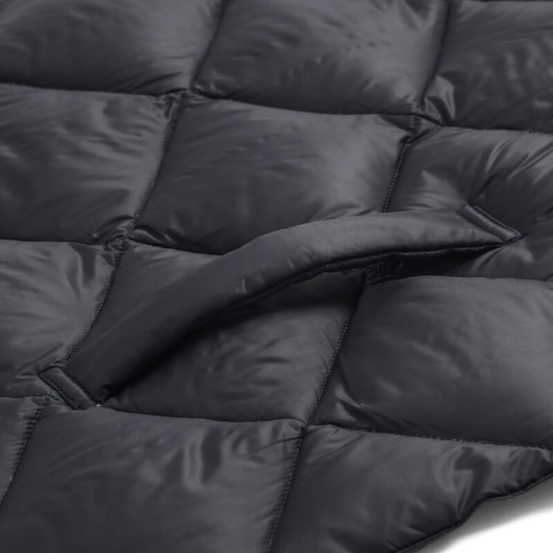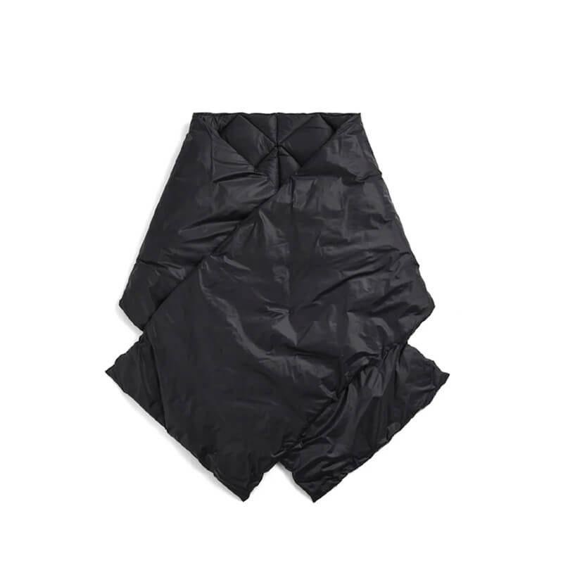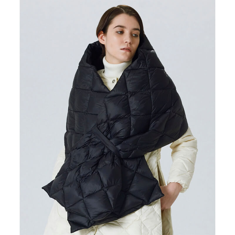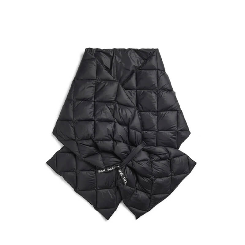 TAION Military Reversible Stole – Black / Black: Down-filled fabrics are paramount to TAION’s designs, with pieces like this Scarf synonymous with the Japanese label. It’s crafted using the usual water-repellent, light, soft, fluffy and voluminous feel that is unique to down, then accented with a color scheme of the TAION logo print.
