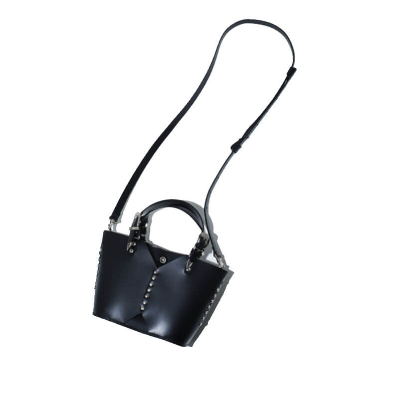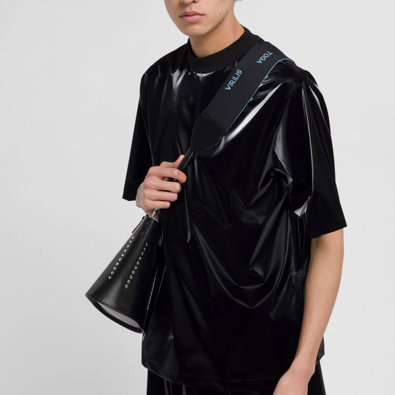 TOGA ARCHIVES Leather Tote Bag – Black: Toga Pulla’s AW22 collection includes this black leather tote. Fusing a minimalist Eastern style with Western influences, the cowhide leather is studded throughout with carry handles made to look like a cowboy’s belt. This Leather Tote Bag features: