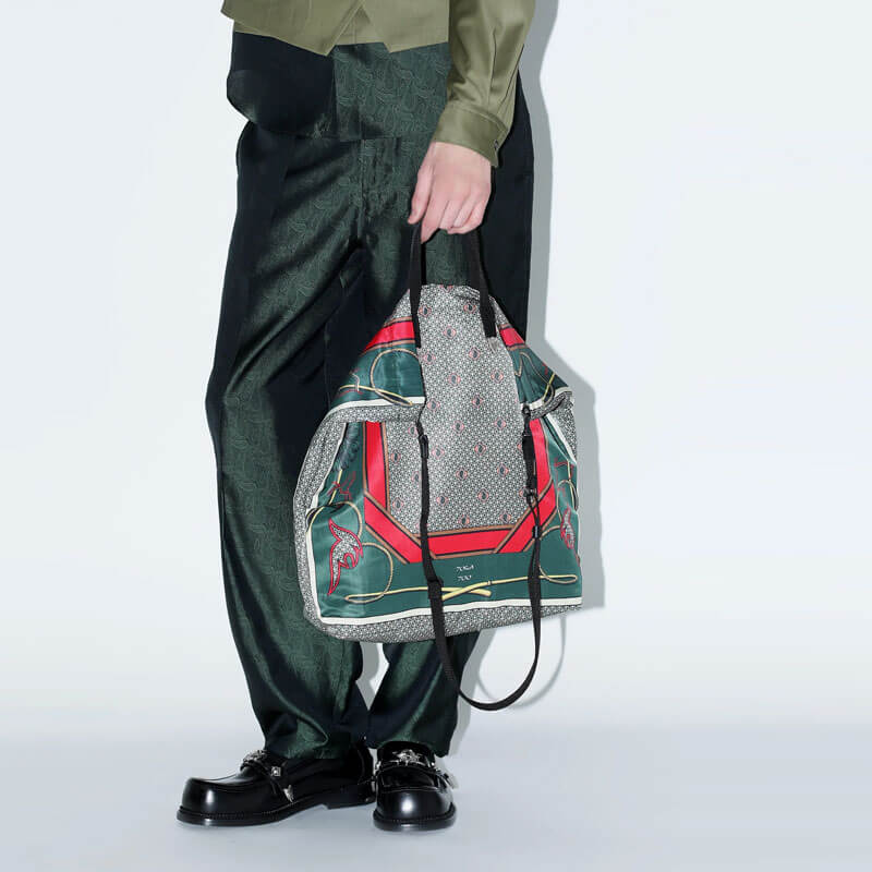TOGA ARCHIVES Print Tote Bag – Green / Red: This Toga Virilis tote bag represent the fashion house’s penchant for vintage and luxurious premium craft, fused with a great contemporary sensibility. This mix-pattern tote bag is case in point; it’s made in Japan from a soft and lightweight fabric and completed with leather strap and alloy details.