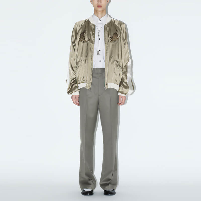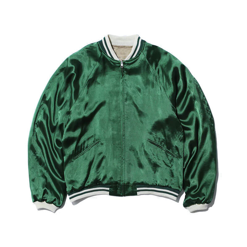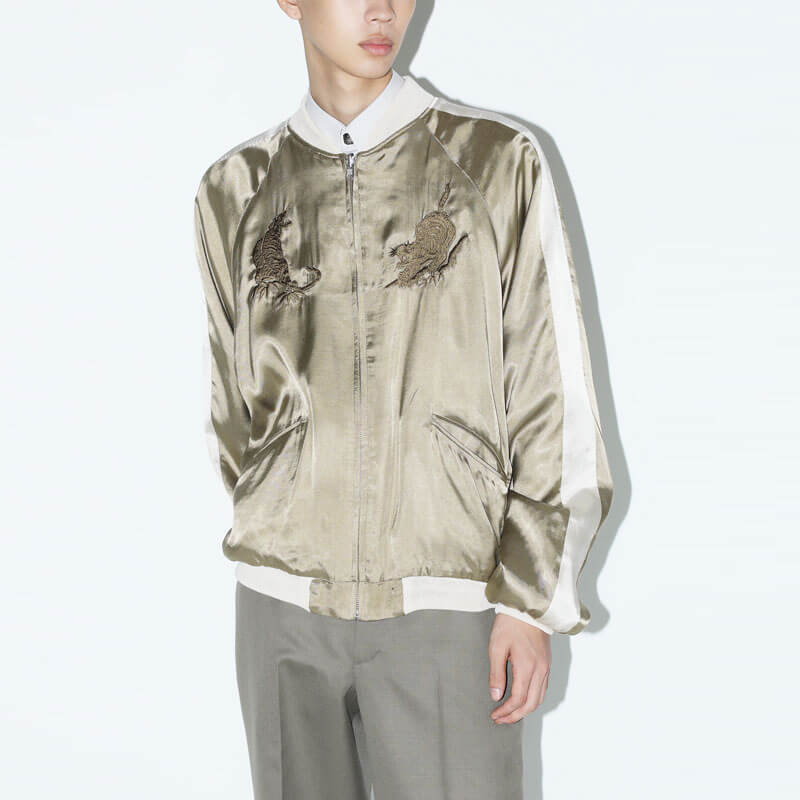 TOGA ARCHIVES Rayon Satin Souvenir Jacket – Beige: Elevate your outerwear game with the TOGA ARCHIVES Rayon Satin Souvenir Jacket. This reversible, Japanese-crafted work of sartorial art fuses bold design cues with refined materials — perfect for fashion insiders seeking a statement piece with versatility. Crafted in Japan from 100 % rayon satin for both exterior and interior, with cotton ribbing and detailed embroidery featuring rayon and polyester threads.