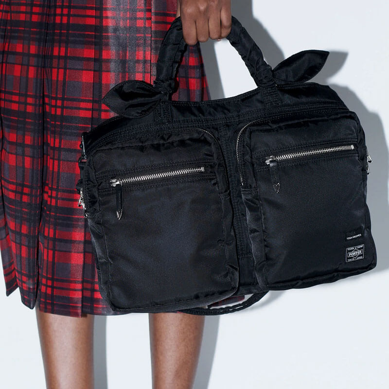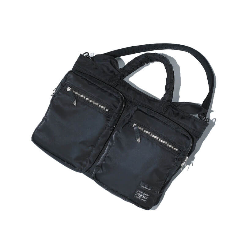 TOGA x PORTER Tote Bag – Black: Iconic Japanese brands Toga Archives and Porter Yoshida & Co. continue a series of incredibly sought after collaborations with the black Tote Bag. Made in Japan, the tote bag blends Porter’s commitment to functional luggage with subtle, yet distinctive, detailing courtesy of Toga. The two front zip pockets feature a central compartment, as well as front slip pockets which are closed by zips adorned with Toga’s iconic metal embellishments. The main compartment features a rear slip pocket, both of which are closed by a Toga press-stud fastening. A wrap effect handle as well as a detachable shoulder strap offer multiple transit options.