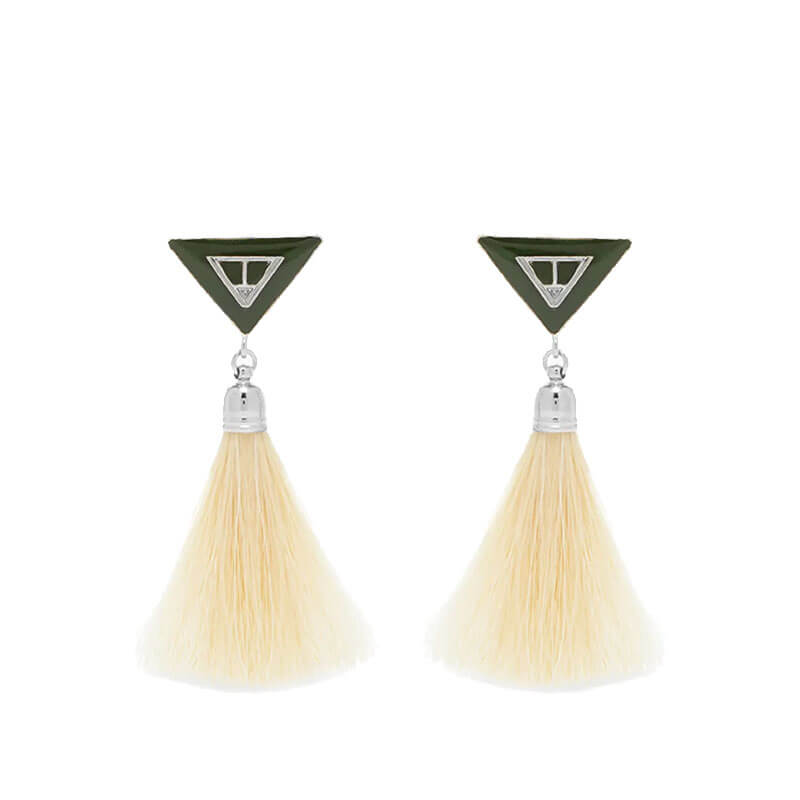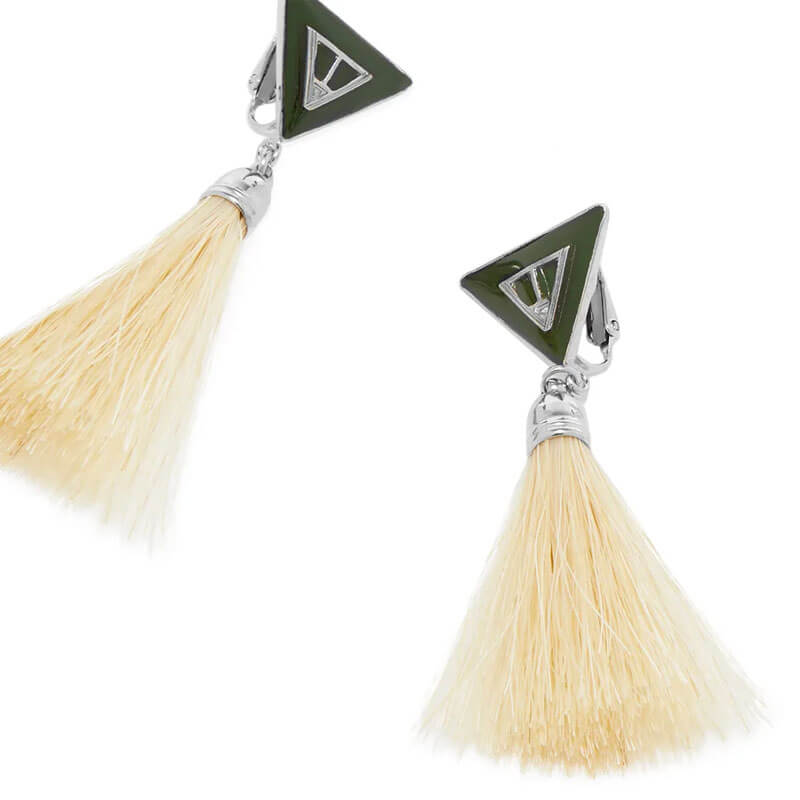 TOGA ARCHIVES Triangle Fringe Earrings – Green: Add a sophisticated touch to any outfit thanks to these clip-on triangle earrings from Toga Pulla. Crafted from alloy, the pair feature green triangles at the studs, then are complete with neutral horsehair fringing for added detail. Included in Toga’s FW22 collection, these Triangle Fringe Earrings features:
