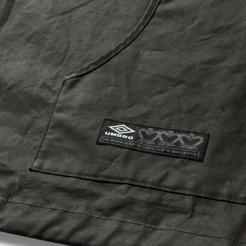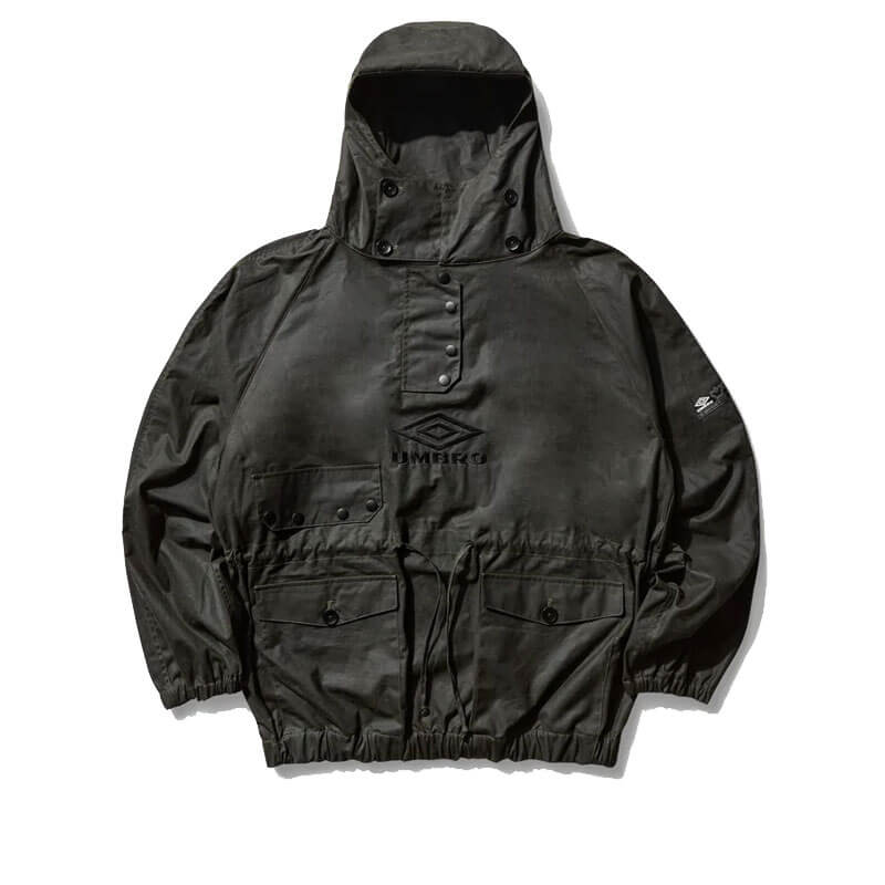 UMBRO Smock Waxed Anorak – Dark Olive: Boxy fit hooded jacket with waxed finish, where Italian retailer Slam Jam tying together Umbro’s affiliations in football and subculture, bringing an unconventional edge to Umbro’s casual styles through a contrast of formal tradition and urban grit.