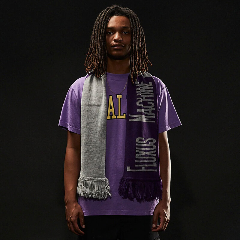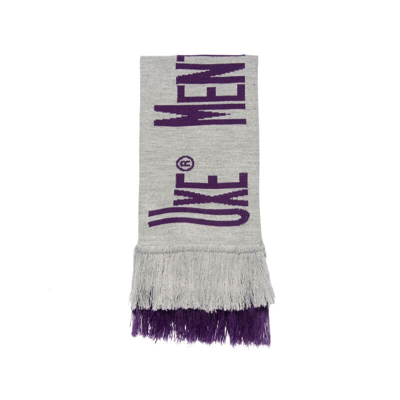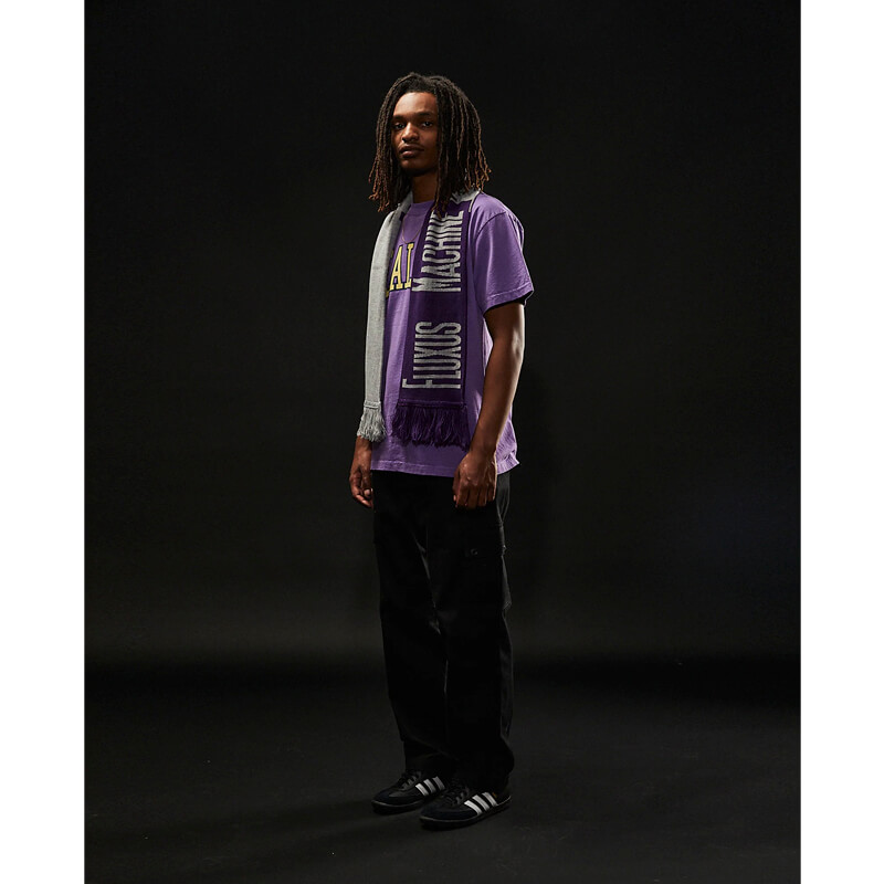 UXE MENTALE Fluxus Machine Knit Scarf – Heather Grey / Purple: This knitted 2-colored scarf features double-sided graphic and lettering from Uxe Mentale FW22 collection. This Fluxus machine knit scarf features: