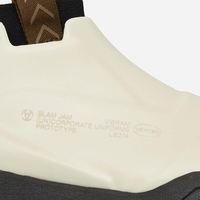 SLAM JAM x VIBRAM® Rubber Core Boot – Asparagus: The iconic powerhouse Slam Jam and Vibram expand their technological and design horizons for the first time. Driven by the desire to find connections between fashion, design and technology, the two entities collide together to create the Rubber Core boots. The final output is a hybrid shoe made in 5 steps, from the sole to the upper. Compared to the standard shoe-making production, Vibram steamlined the process thermoforming on a 3D last a Vibram StratX rubber sheet to realize a one step upper.