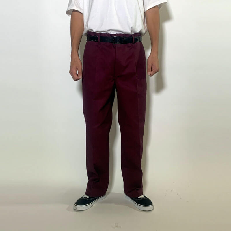 WACKO MARIA DICKIES Pleated Trousers – Burgundy: DESIGN BY WACKO MARIA / PRODUCED BY DICKIES DICKIES IS A WORKWEAR BRAND THAT ORIGINATED IN TEXAS IN 1922 EMBROIDERY ON LOWER RIGHT BACK POCKET