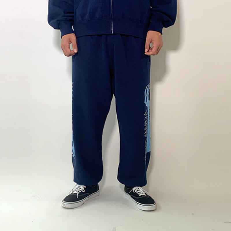 WACKO MARIA NeckFace Heavy Weight Sweat Pant – Gray: Sweatpants made in collaboration with NECKFACE, a graffiti artist based in LA. They are made of heavyweight cotton sweatshirt fabric that has been washed to give it a moderate texture and avoid shrink. The moderately oversized silhouette ensures a relaxing atmosphere and ease of movement, while a graphic drawn by the American artist printed on the side complete the design.