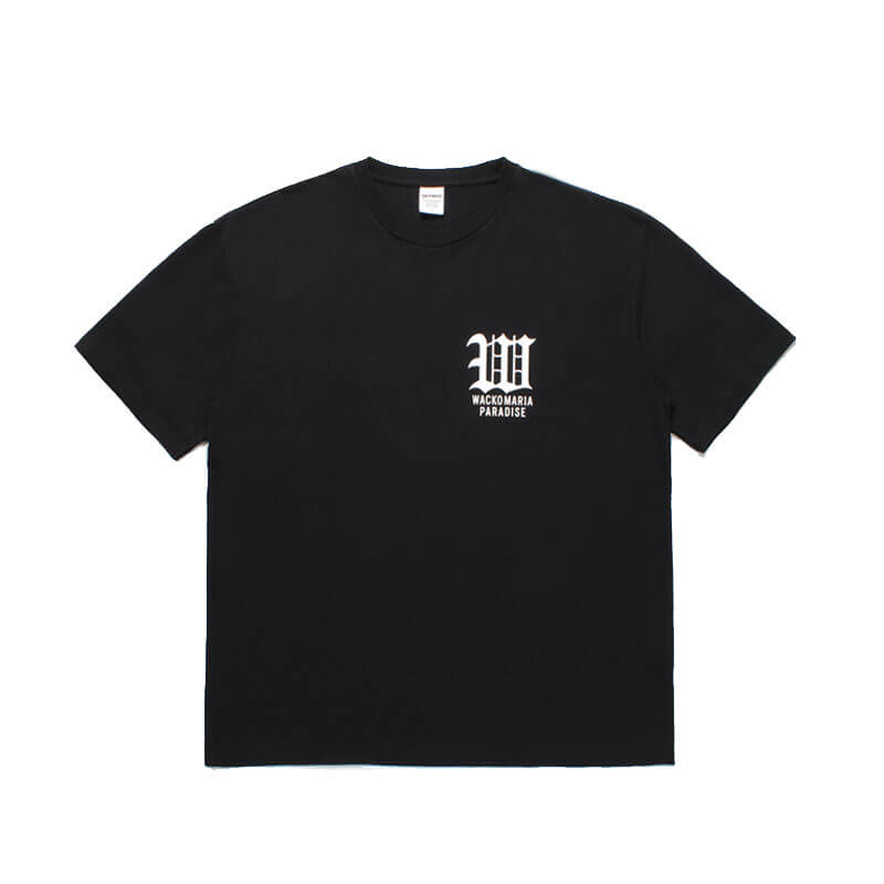 WACKO MARIA W Heavy Weight Tee – Black: Heavy weight cotton tee with graphic logo printed on front chest. Pre-washed garment to avoid shrink.