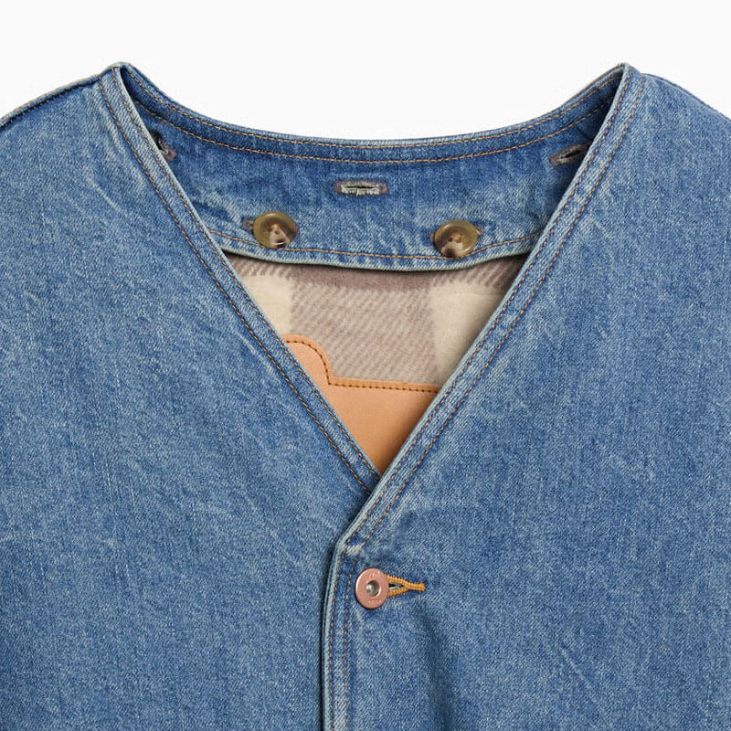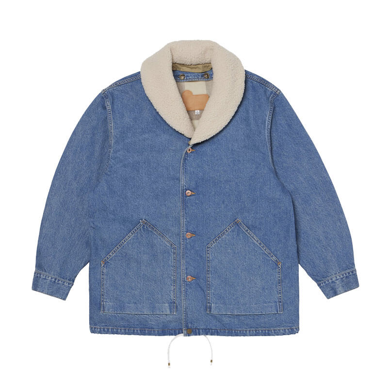 WOOLRICH JAPAN 11.5oz Denim Ranch Jacket – Indigo Blue: The design features a boa fleece loofah collar and an inner knit fleece vest. These are both detachable, making it a 3-way piece that can be worn throughout the seasons. When the collar is removed, the jacket becomes a casual combination of an engineer jacket and a coach jacket.