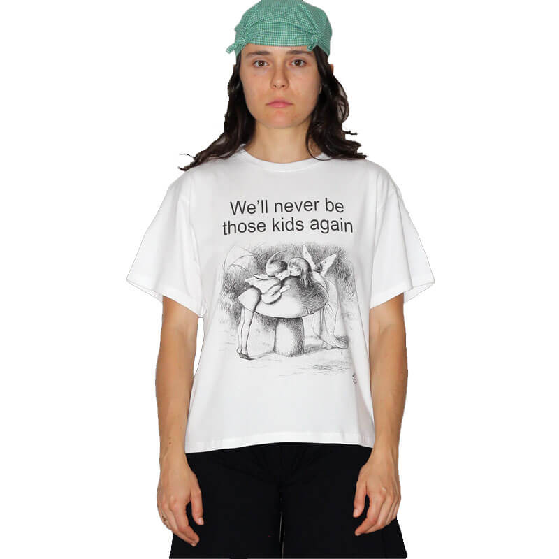 AMUNT™ Those Kids Again Tee – White: Inspired by Frank Ocean’s Ivy, a song from Blonde that captures the ache of lost youth and the poetry of memory. The t-shirt features a classic storybook-style illustration, juxtaposing innocence with emotional depth. This crossover of visual languages, the raw lyricism of Ocean and the naive softness of the image, creates a quiet tension, like a lullaby for something that’s already gone.