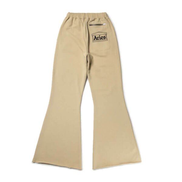 ARIES Flared Sweatpants – Pebble: Sweatpants made from 100% cotton brushed-back jersey fleece in a new low-waist ultra-flared cut. With a rib waistband and featuring a back zip internal patch pocket with Aries temple logo print.