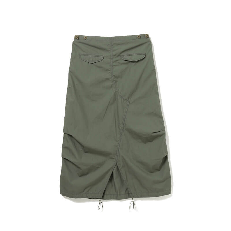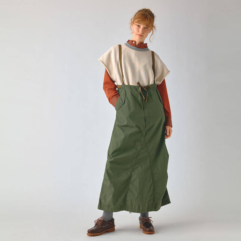 BEAMS BOY Army Convertible Overall Skirt – Olive: This high waist convertible skirt reimagines traditional military design with a modern, functional aesthetic. The sub-label of the Japanese streetwear icon Beams, emerged in the late ’90s as a brand for women that sought out the durability, function and tailoring of mens sportswear and military influenced styles. Crafted from a durable cotton blend, this piece converts from skirt to dress through detachable overall straps and a drawstring hemline to allow versatile styling options. A button-and-zip closure with an adjustable drawstring waistband provides a customisable fit while snap button pockets at the sides and back enhances the garment’s blend of vintage utility and contemporary style.
