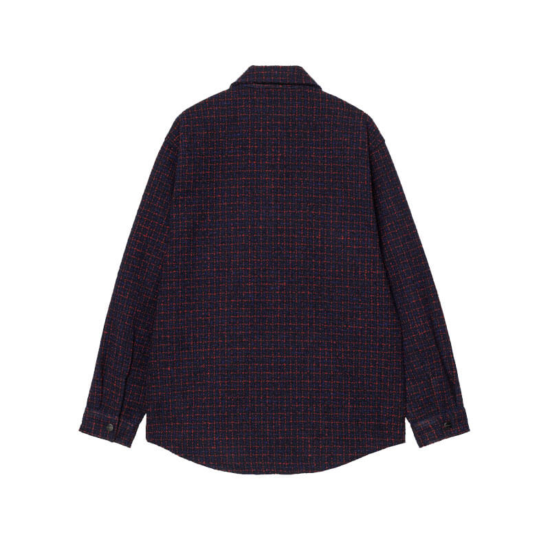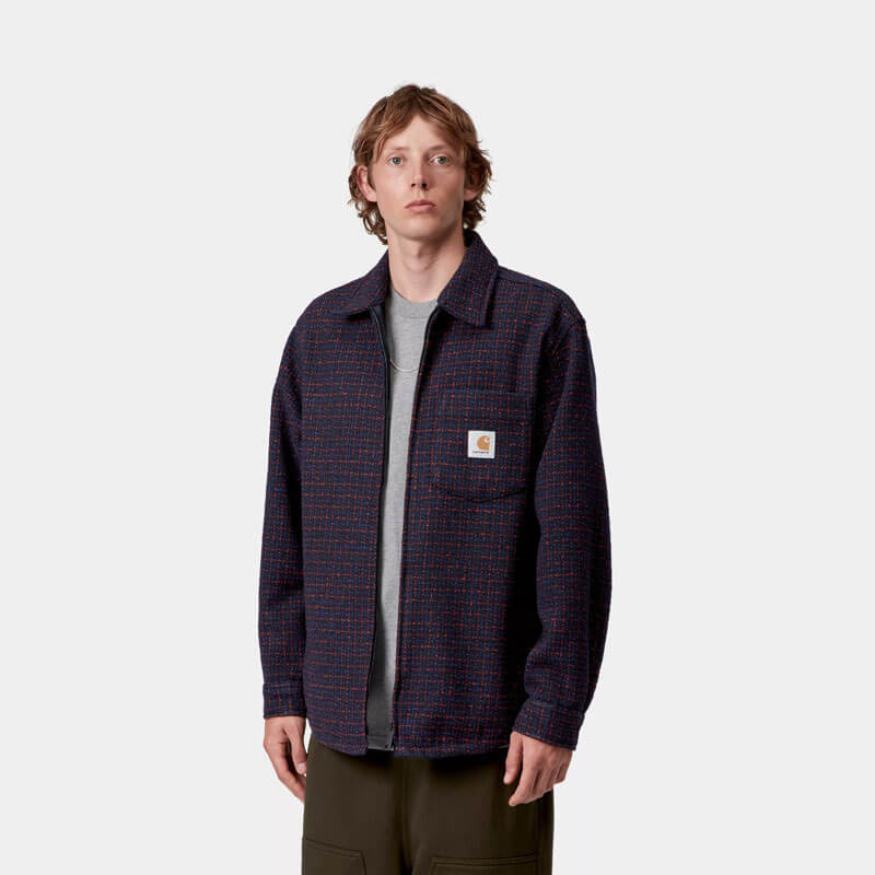 CARHARTT WIP Bellamy Shirt Jacket – Check / Deep Night: The Bellamy Shirt Jacket is made from unlined, heavyweight polyester bouclé with an allover check pattern. It features a chest pocket as well as two side seam pockets. The item also has a two-way front zip closure. A Square Label completes the design.